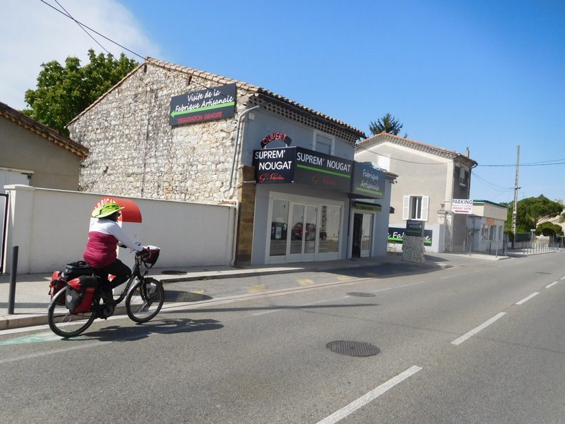 The route continued uneventful until we neared our next major objective - Montelimar. To go into the town was going to mean a 10 km (minimum) detour, in which we would go in and literally back out on the same path before continuing to our B&B, 20 km downriver. Dodie clearly outlined the cost in km of going into Montelimar, the distance remaining after that, the headwind, and the time used up in La Voulte. But she was not actively recommending we give Montelimar a miss. So that meant we were going for it. Weighing 250 g. of artisanal nougat in the balance of my head against distance, time, wind, etc. is no contest. I once ran us 20 miles on 3 speed bikes in the Rockies for a muffin! (True story).