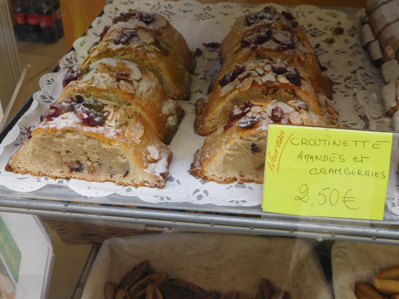 We chose a bakery from among many, and Dodie suggested I go in and choose anything at all. That's because of the special day. Normally if sent in alone I come out with stuff that is too much or too gooey, or both. This bakery had something I had not seen before, that they called "croustinette". They had this pistachio, cranberry, and other varieties. I was very happy with this choice. We ate this and the rest of our lunch in a little square, interesting and with good benches. There was also a stone wall concealing a great washroom nook!