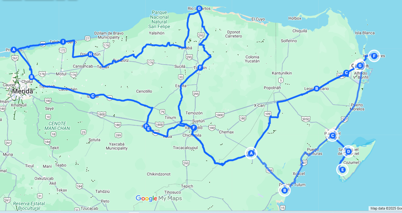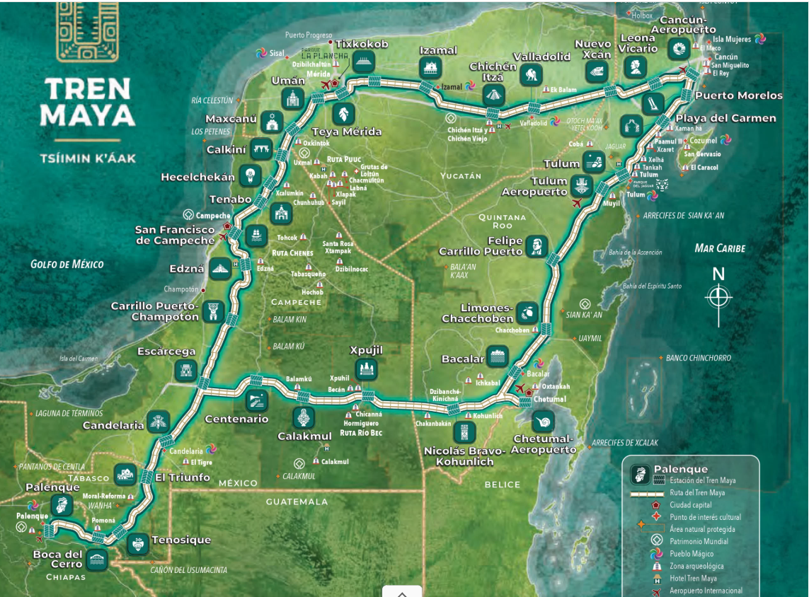 The route is nominally 1200 km, and includes about a month of cycling. It's quite conservative, showing that we will not be venturing this time into Merida or the territories south and west of it. On the other hand, a train route has now been built. It's called the Tren Maya, and we hope for another time that it could open up the south to us a bit. It's tricky, because just the existence of the train will not automatically create places for cyclists to stay in the remote areas it may access. The Tren Maya route looks like this: