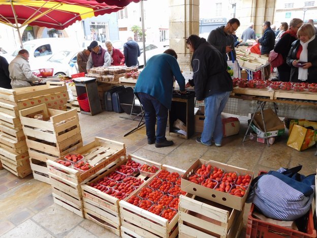 A quick spin down the canal and we arrived at Valence d'Agen. Here was another beautiful town, and we could sense it had a market just from the number of people parking their cars and extracting market baskets. Sure enough in the centre of town was another covered space, and even more strawberries!