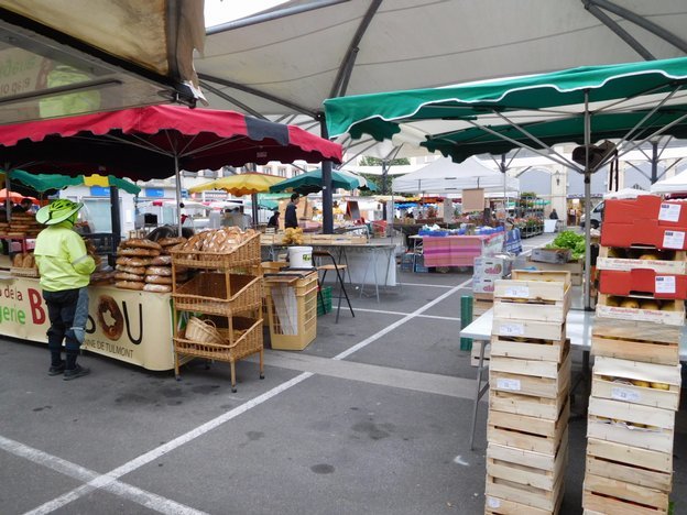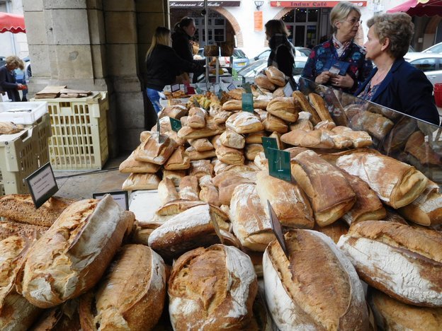 We carried the market treasures we had bought to a small group of tables, just beside the open market and the covered market. We assumed these tables were provided as part of the markets. But shortly after we had spread out our berries and pastries, a man appeared to take our order. He was from the bar across the street. This is a European phenomenon that, like miniature "cups" of coffee, we have not yet assimilated. Restaurants can be running outdoor tables quite far from their premises, and waiters may "run" quite some distances with full meals. In this case, the bar was nearby, but across a narrow street. Touche. So, I ordered one of those miniature coffees to keep the man happy.