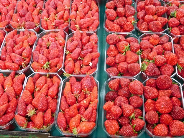 The market benefits from a good partial roof, and is situated directly in the centre of town. And yes, there were strawberries galore. These seemed to be of two main varieties. "Dely" were rather long and elegant, while "Garriguette" was shorter and stockier. Dodie went for the elegant ones, though they were 50 cents more per basket. What a wild and crazy lady!