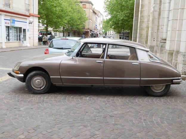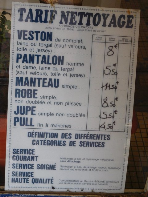 Left to watch over the bikes while Dodie checked out the market, I noticed a nearby Citroen car. This was the swoopy model that has the adjustable rear suspension. It was model DS-23. Probably not at all rare in France, but still not a common sight. The second thing noticed was a dry cleaner shop! (This bike watching must be boring!) Specifically, there was a sign in the window giving some of the main prices for different kinds of clothes cleaning. Not only was this a little lesson in the French words for various clothes, but there were additional details - like "Dress, not lined, not pleated". I have always known about bread prices posted in bakery windows, and can sort of understand that. After all, revolutions have been won and lost over bread. But I am unlikely to bring a government down when ripped off over cleaning my pants! The law that required the sign is just another slight cultural difference that a tourist like me might notice, when stuck babysitting a bike!