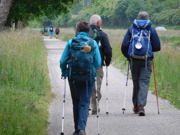 We greeted some of the walkers who were still in the town and set off along the canal path. Here we found the other walkers, strung out according to their starting times and walking speeds. On the Camino, we had always enjoyed seeing who was the most advanced walker, and then trying to sort out fast or early ones from villages further back from slow or late ones from villages further on.