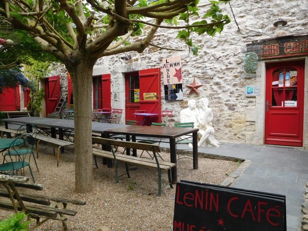The path takes a run down a long island, called Ile de Chalonnes. This is a fairly unremarkable area, except that along the way is a something called the Lenin Cafe. Each time we pass here, it is closed. But it still catches our attention for the large poster of Lenin on the front, and for wondering what is in its always closed "free museum". Here are our latest, if unchanging, photos of the Lenin cafe.