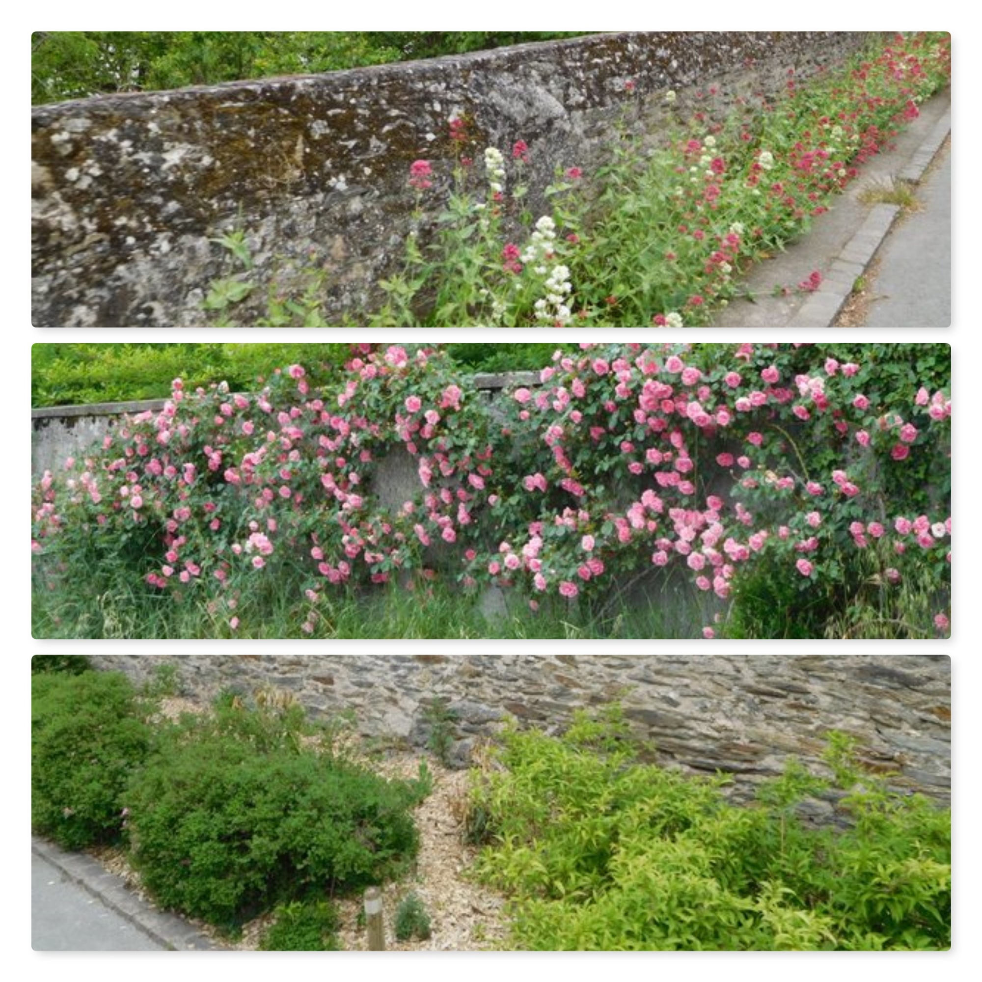 If not right by the river, we were on small roads, passing cute cottages, usually with a lot of flowers. Stone walls, usually formed from slate are popular here, so there were lots of examples of flowers along walls, like this: