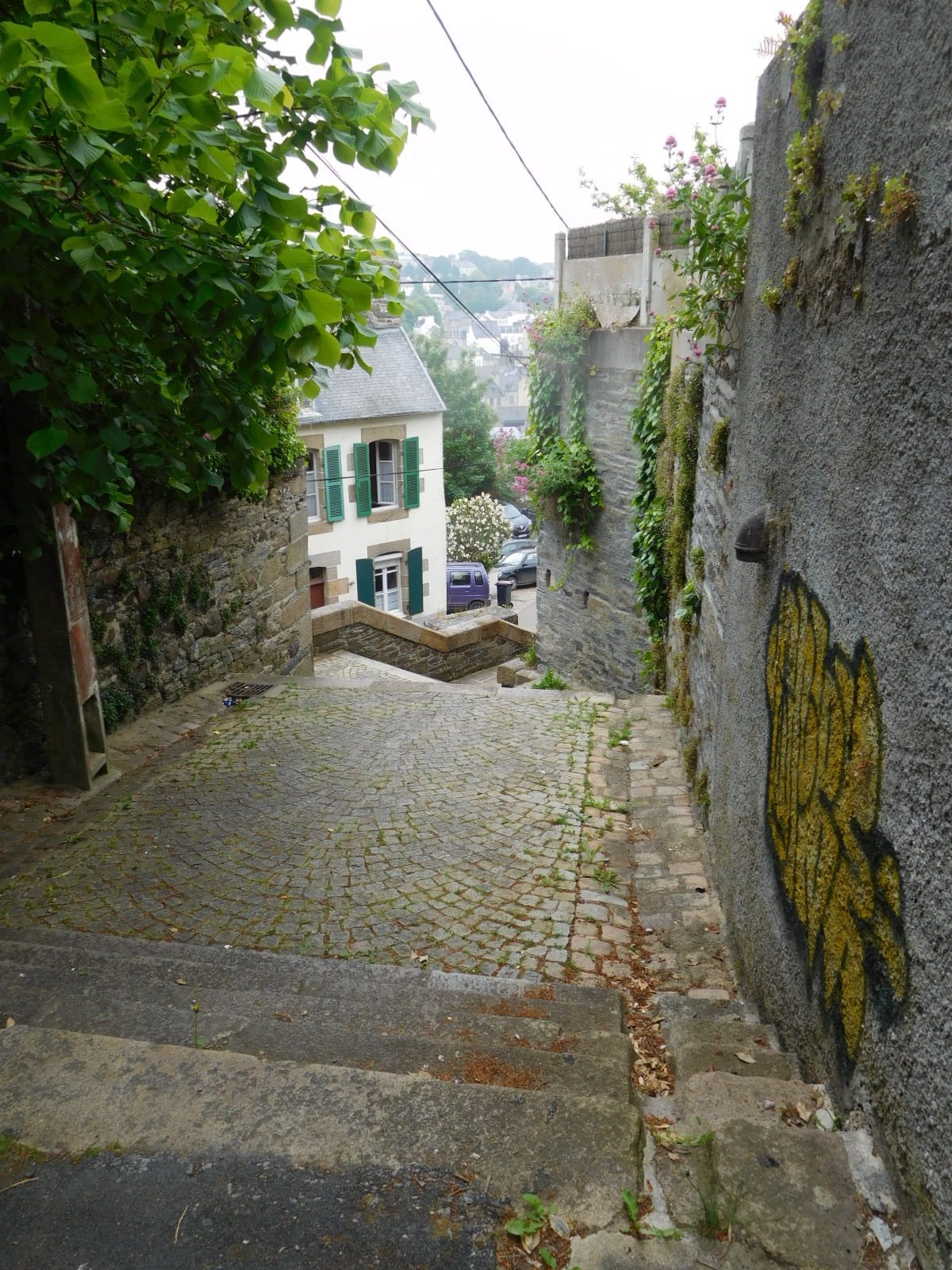 We really had no idea what to expect of Morlaix. That is, we knew nothing of the layout, the style of architecture, the accessibility - nothing. So it was quite an adventure as we drew near and got some peeks at what was ahead. Then, as often happens, the rail trail just ended - dumping us out unceremoniously and with no further signage, up on a hillside. We cast about for the way to go, which was clearly down. Our first try ended in a cliff like impasse, and our second try in a laughably steep descent. With the hydraulic brakes, the descent was actually possible, so down we went. We passed a high walled former Urseline convent and were able to sneak one photo of the inside.