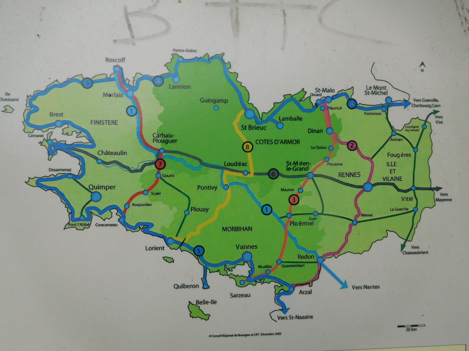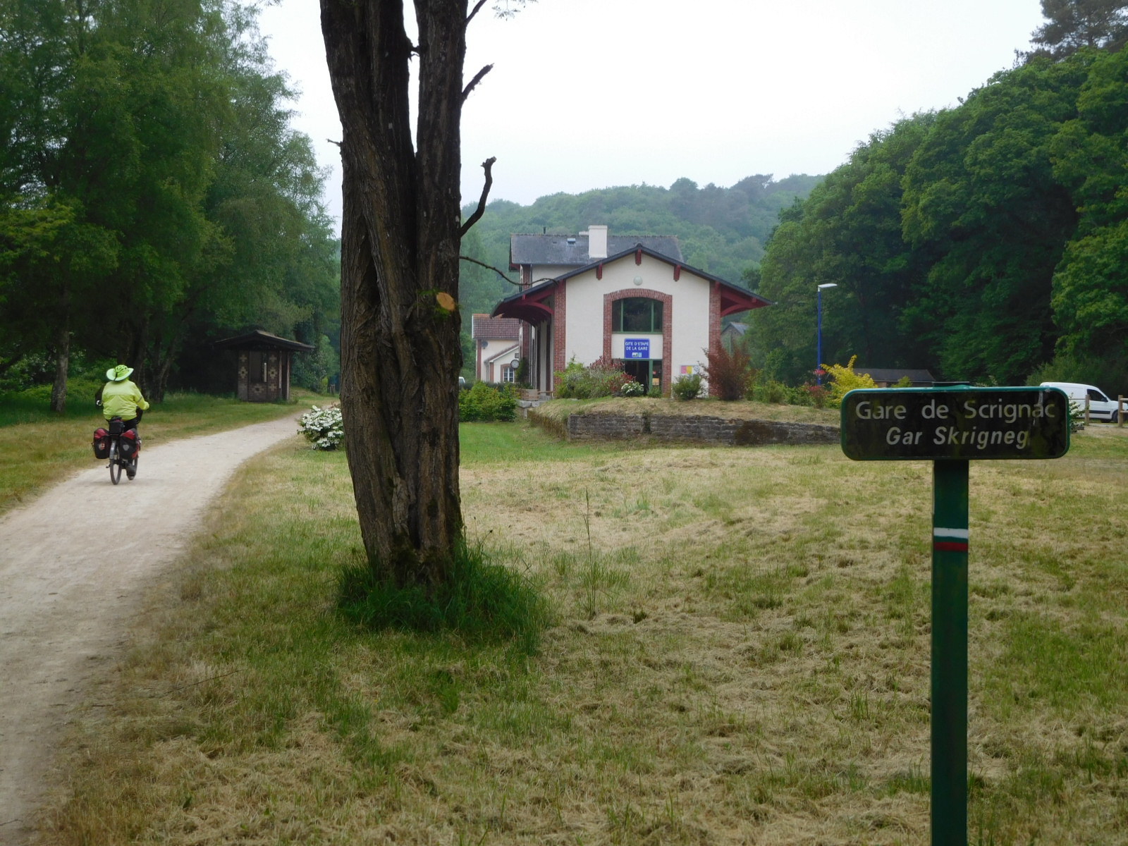 The next thing that we knew but did not fully appreciate was that the bike route from Carhaix to Morlaix is not just a route, it is a greenway-rail trail. That means it is off road all the way, and even more perfectly signposted, if possible, than the other cycle routes. And it's even more than that. This trail out of Carhaix is only one of several. A sign along the way explained it:
