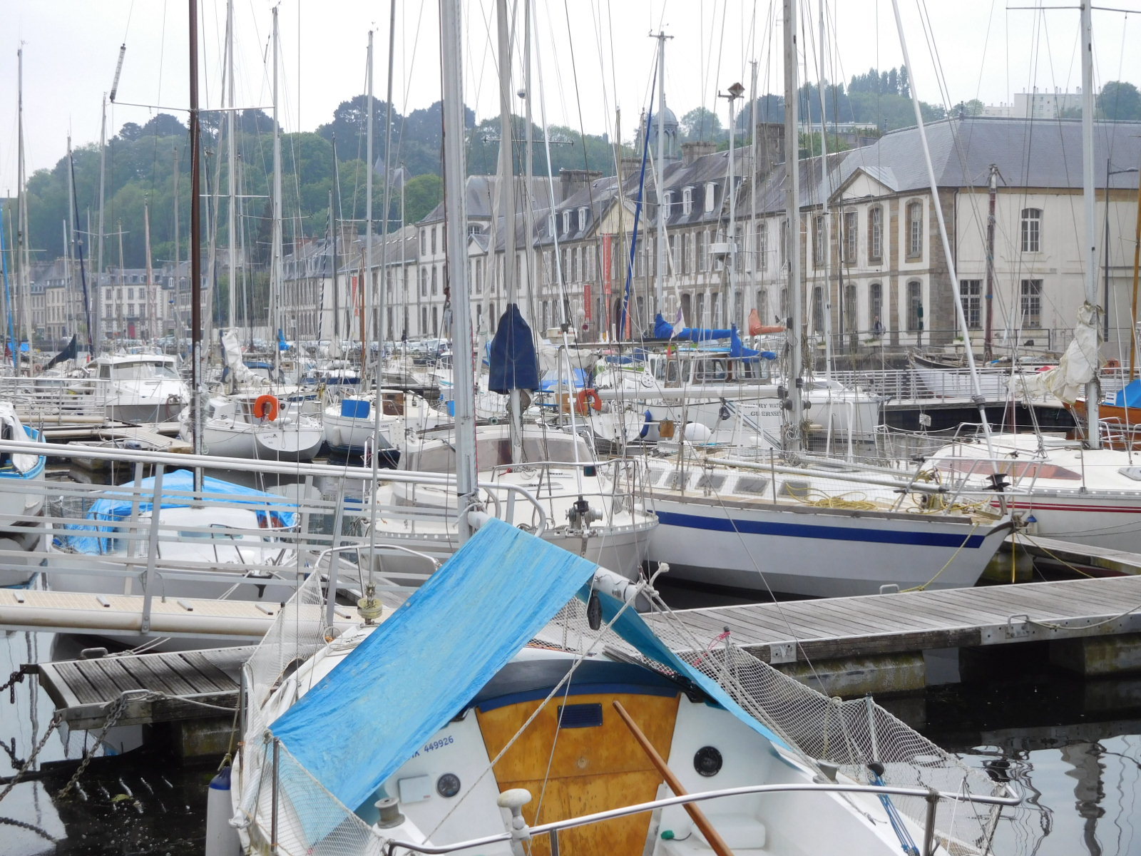 We were eager to get maps 2 through 5 in a series of 5 covering the coast to the east, for which we had already stumbled on map 1. That meant a visit to Tourist Information. We already knew, of course, that they would not be open from 12-2, so that's why we had gone to lunch at the creperie. If you can't beat them, join them! Probably the TI staff were at the next table. But even when trying, we can not easily blow 2 hours over lunch, so we were still early for the TI. So we sleazed on down for a look at the harbour, and came back with this impression: