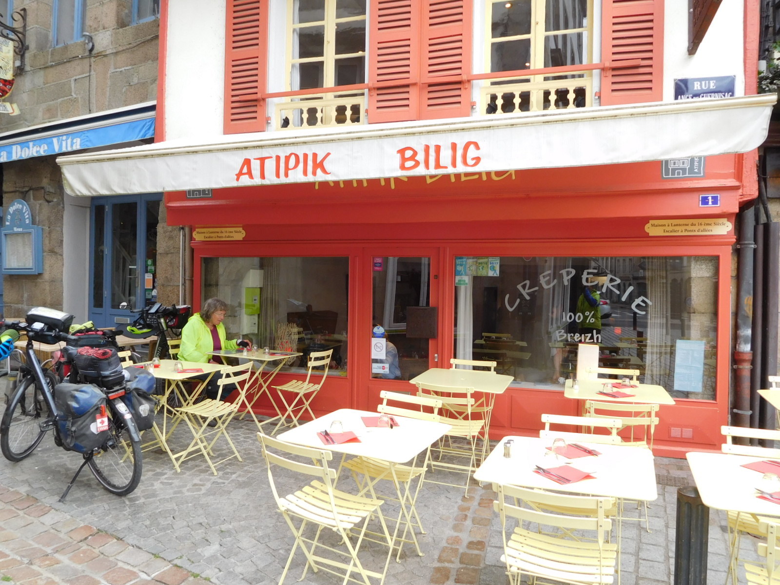 Suddenly we had succeeded in popping out in the square behind the main square. This turned out to be right on our route, where our map had shown us a creperie. We found it easily. It was called the Atipik Bilig. Once you know that bilig is the round griddle used for making the crepes, all that's needed is to know atipik, and we're speaking Breton!
