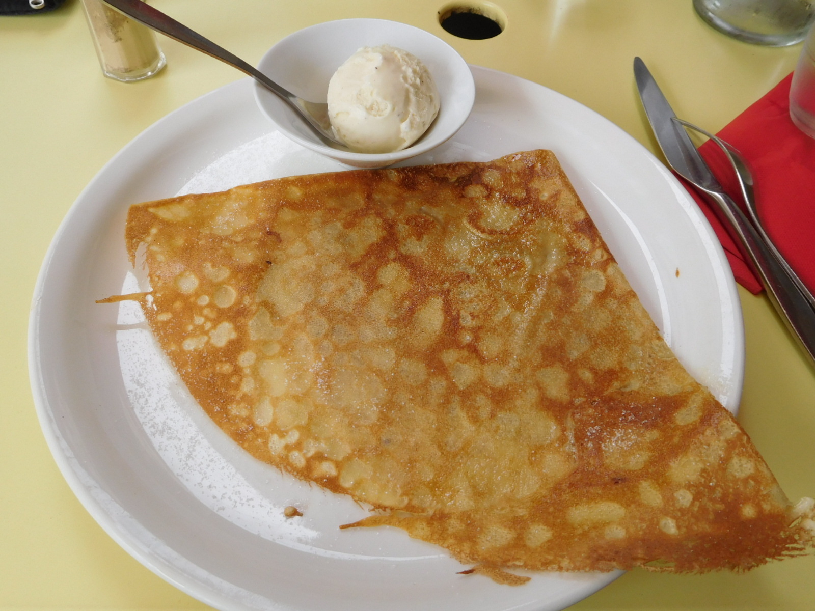 Earlier I had written that large and slightly crispy crepes seemed to be unique to one restaurant in Quebec. Not so. I think the one out of line was that vendor in Redon, who had produced a small, soft, rolled up specimen. At the Atipik Bilig, our crepes were large and slightly crispy. This varies also by the type. Savory crepes are made with buckwheat flour, and are normally called galettes. These tend to be larger and crispier. The sweet ones are made with froment - wheat, and may be a little smaller and less crispy. We got galette of egg, ham, and Emmental, and crepes of sugar and cinammon with ice cream, in my case, caramel beurre salee for Dodie. They were really good, and in the middle of Morlaix, in the heart of Brittany, they were darn well authentic.