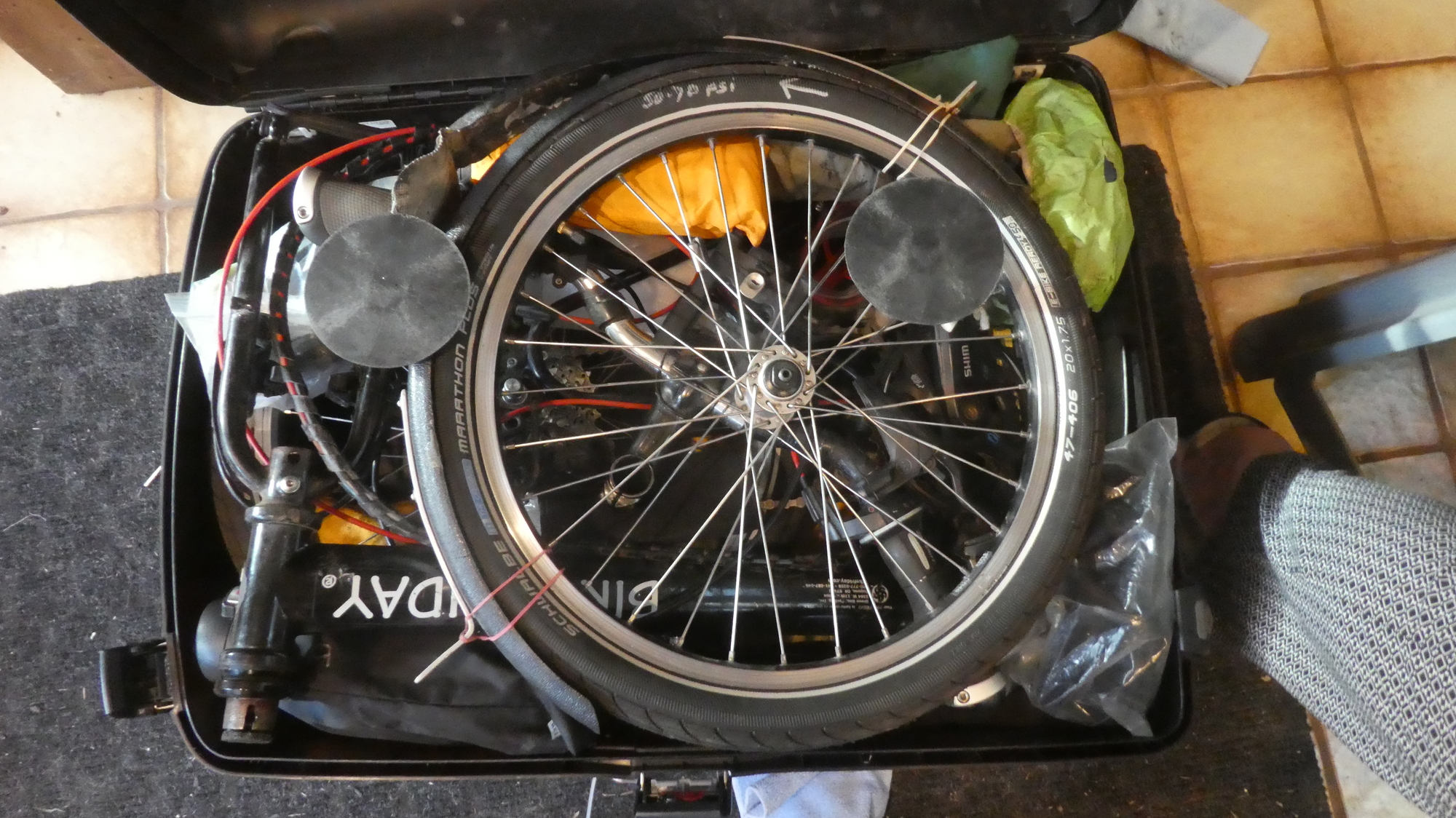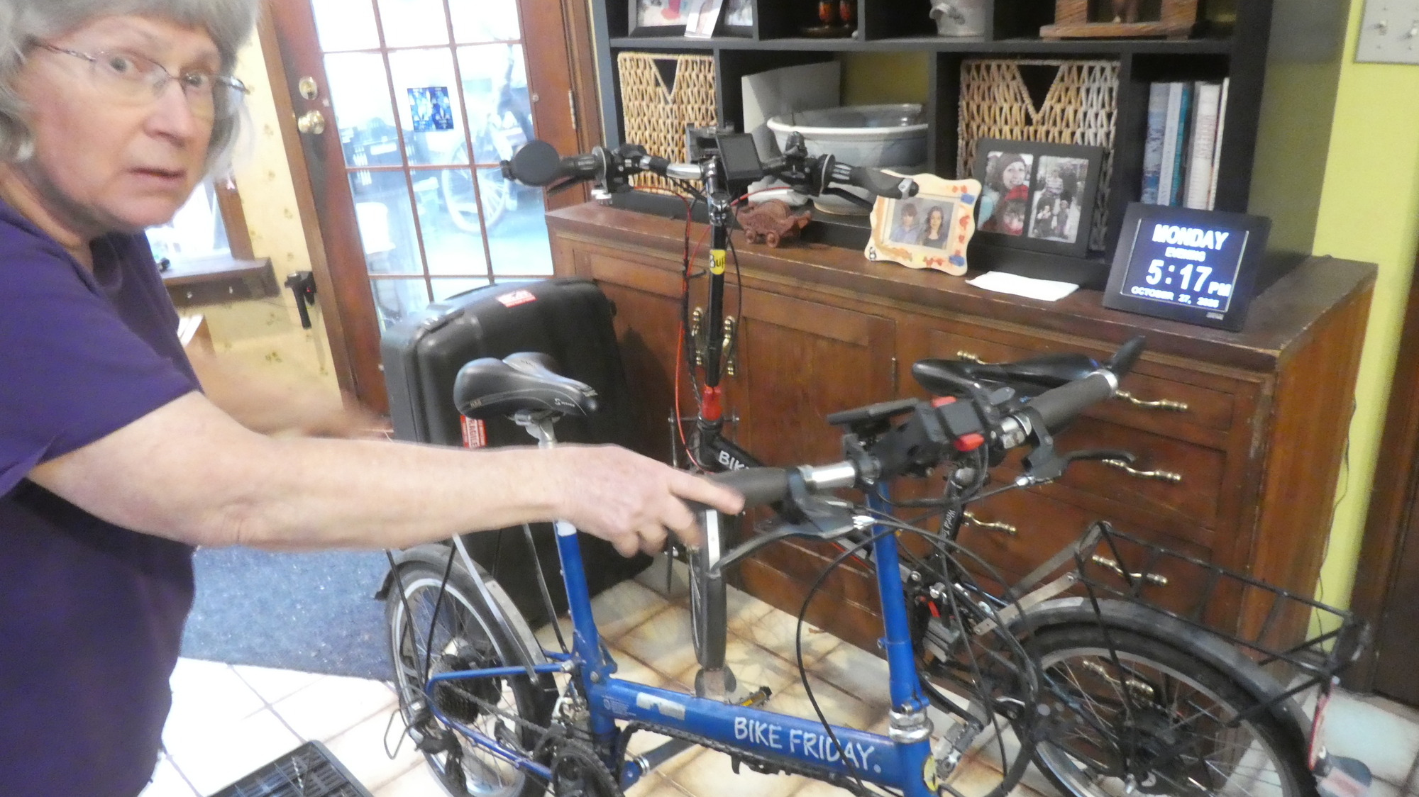Putting the Bike Fridays into their suitcases is always a bug. To begin, racks, pedals, fenders, and mirrors have to come off. And brake levers and other things on the handle bars need to be loosened so they can rotate out of the way. The front wheel comes off, the hub motor cable is disconnected, and then the bike is folded. The geometry of our two bikes differs, so they each go into the case their own way. But there is only one way for each that works. If an airline or border person takes anything out, they have no hope of getting all back in!