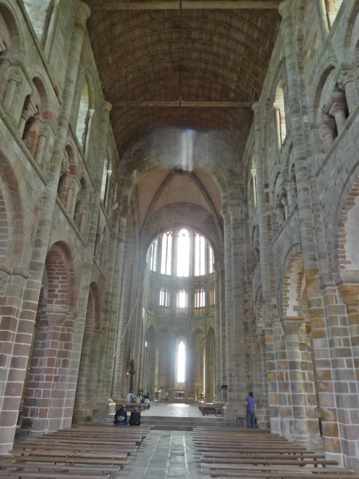 When one comes to Mont St Michel it is the architecture in the form of the vertical construction, the massive church built on supporting crypts, the higgledy piggedly picturesque town buildings, and the intertidal sand flats and polder fields beyond that immediately capture all attention. Walking up to the church, it was all of this that struck us immediately.