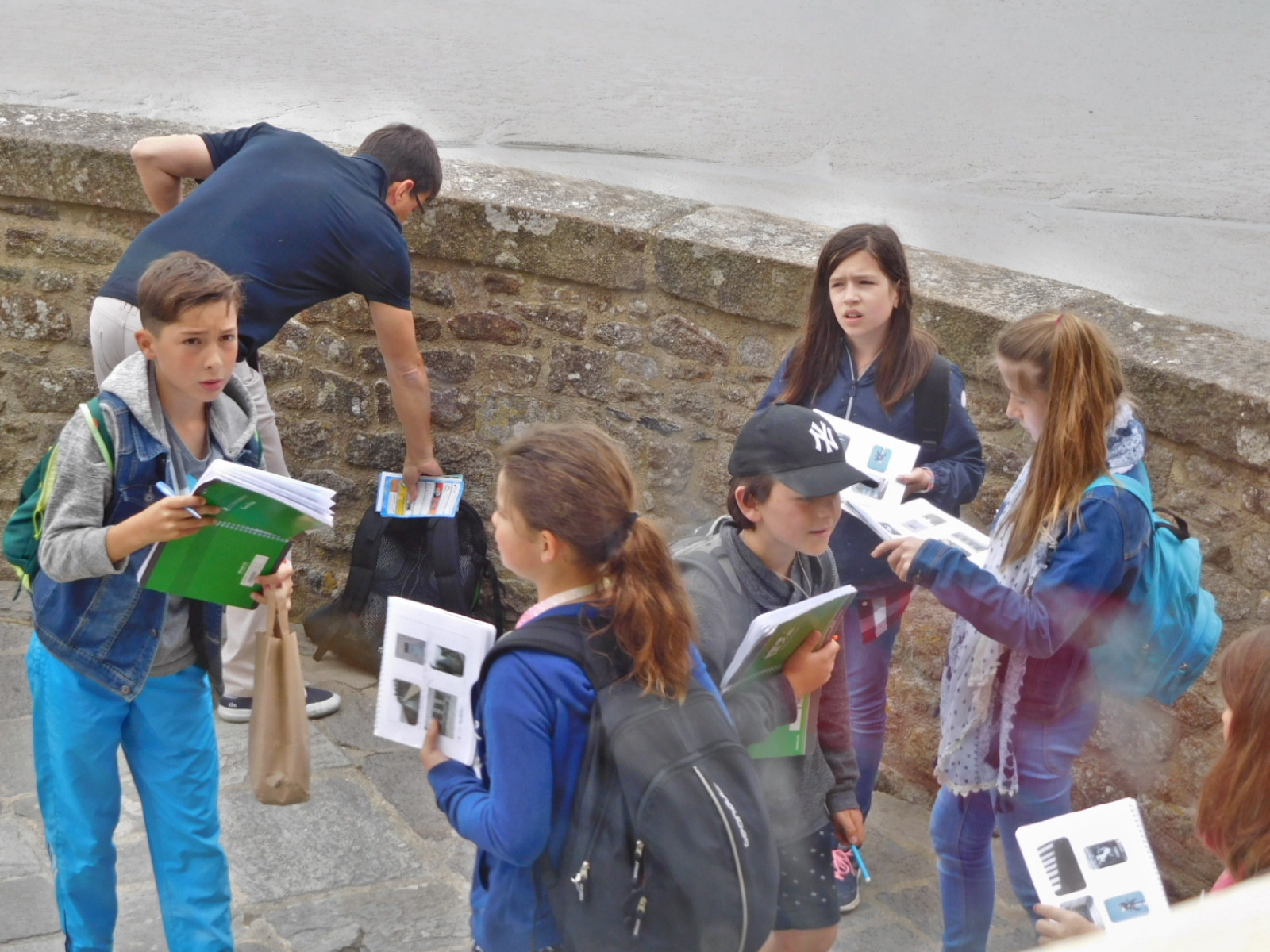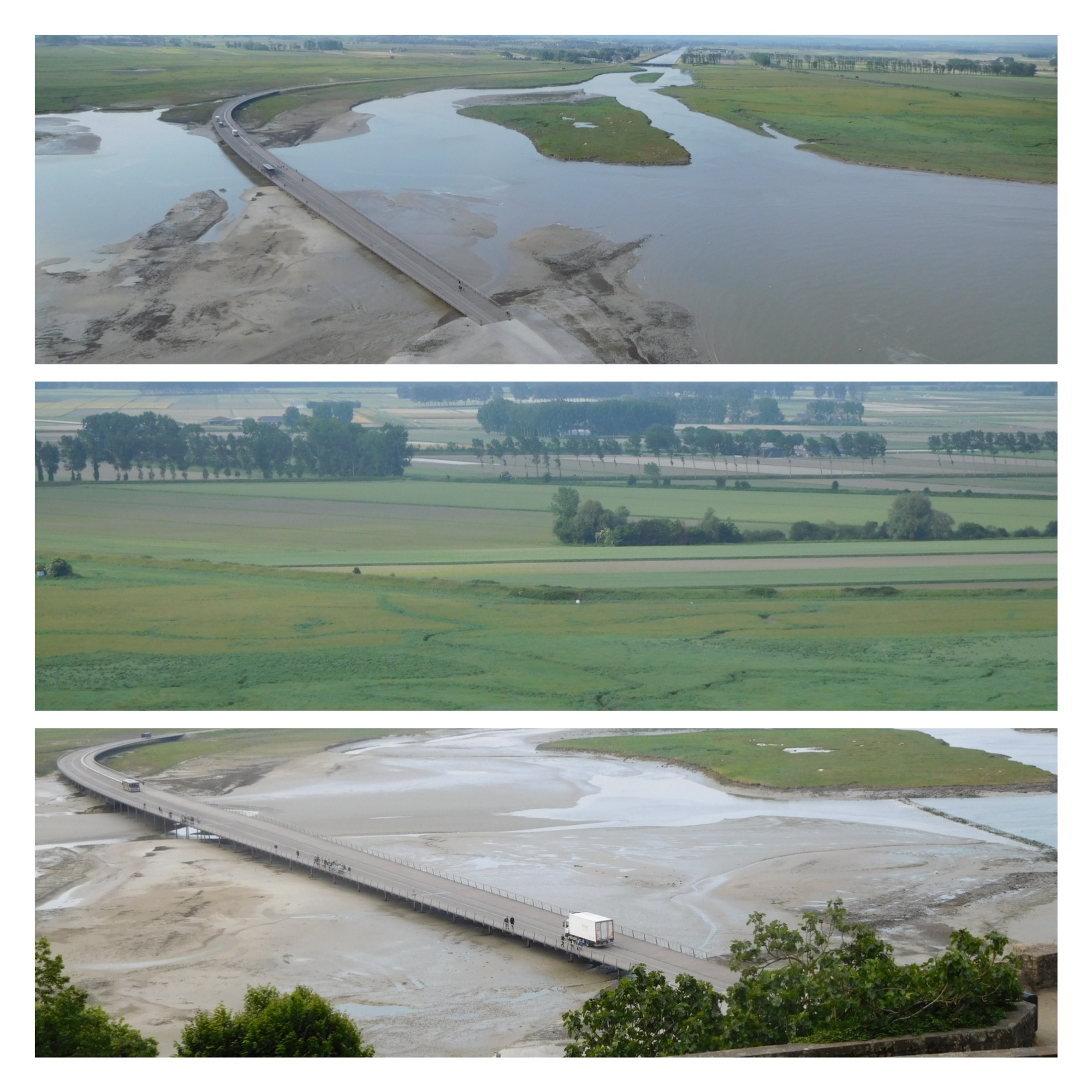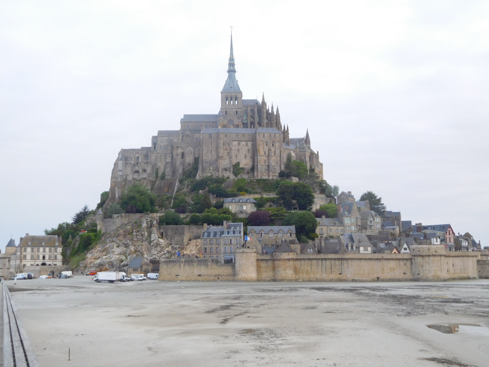 Up until 2013 there existed here a solid causeway that led to a large parking lot directly at the Abbey buildings. It was found that these structures were interfering with the natural flow of tidal water and especially silt, and that the bay was getting silted up. The solution was to remove the causeway and parking lot, substituting the bridge suspended on legs and the system of free shuttle buses running from an inland parking lot. There were fun shenanigans about this, which I have so far only read a bit about, involving where the shuttle buses would run from and stop. Apparently the mayor at the time had them stopping in front of businesses he owned and bypassing those of competitors! He was taken to court and fined 30,000 euros over this.