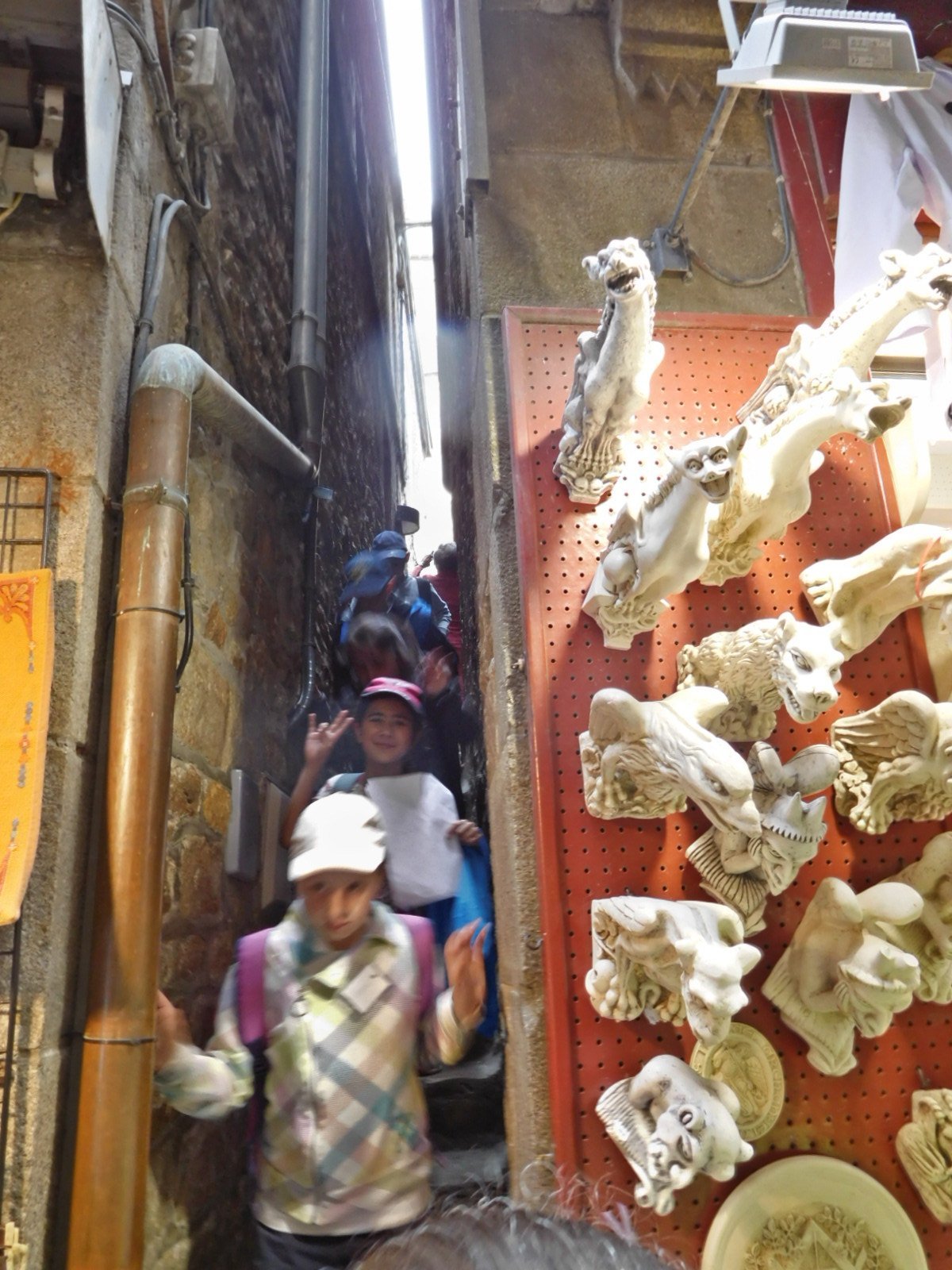 When we got to the entry point for the Mont we temporarily outfoxed the group. That is because we had already to decided not to walk up the street of shops on the way to the Abbey above, but to take a back entrance as outlined in Rick Steves' guidebook.