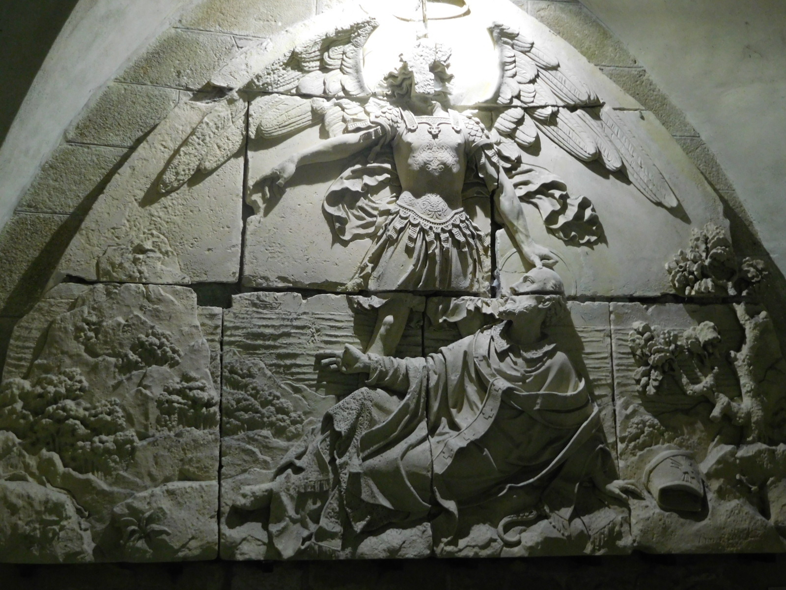Evidence of the destruction from the Revolution could be seen in "defaced" (litteraly) or beheaded statues. For example, here we have Michael sticking his thumb into Aubert, but he has lost most of his head.
