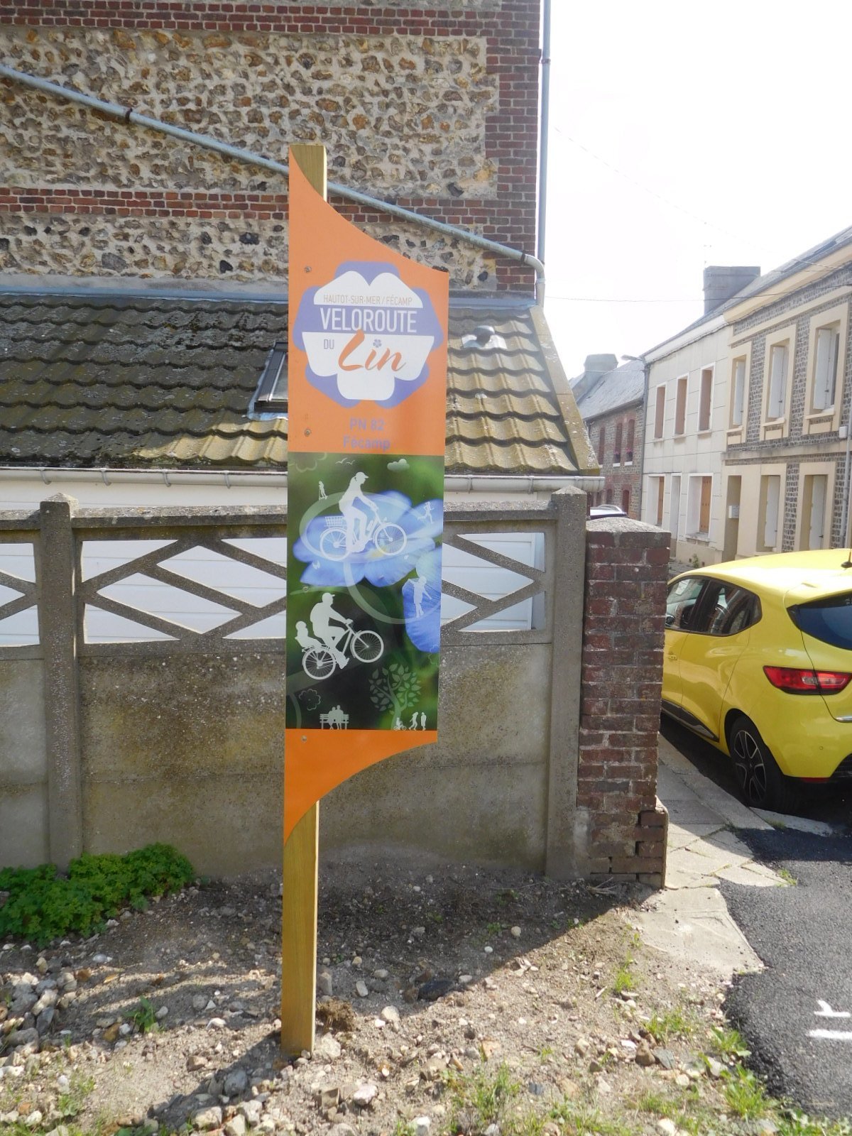 Fecamp is the point at which we could decide to wiggle along the coast, as we had done in Brittany, or try out the new Veloroute du Lin, which goes 70 km, to Dieppe. We chose the "Lin" and were on it for a couple of kms before coming to our booked B&B. The Veloroute looks really good, with a new and smooth hard surface, consistent style elements like the blue paint on the road at crossings, cedar car inhibitors, and attractive signage. We think this may be a rail trail, but in any event we are getting ready to put it on our trophy shelf as a great newly discovered route. A sign near the beginning states the cost as 4,000,000 euros and the time used to build it, one year.