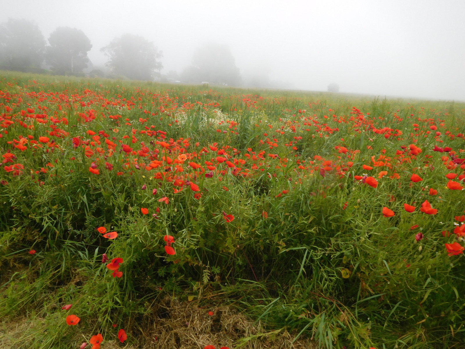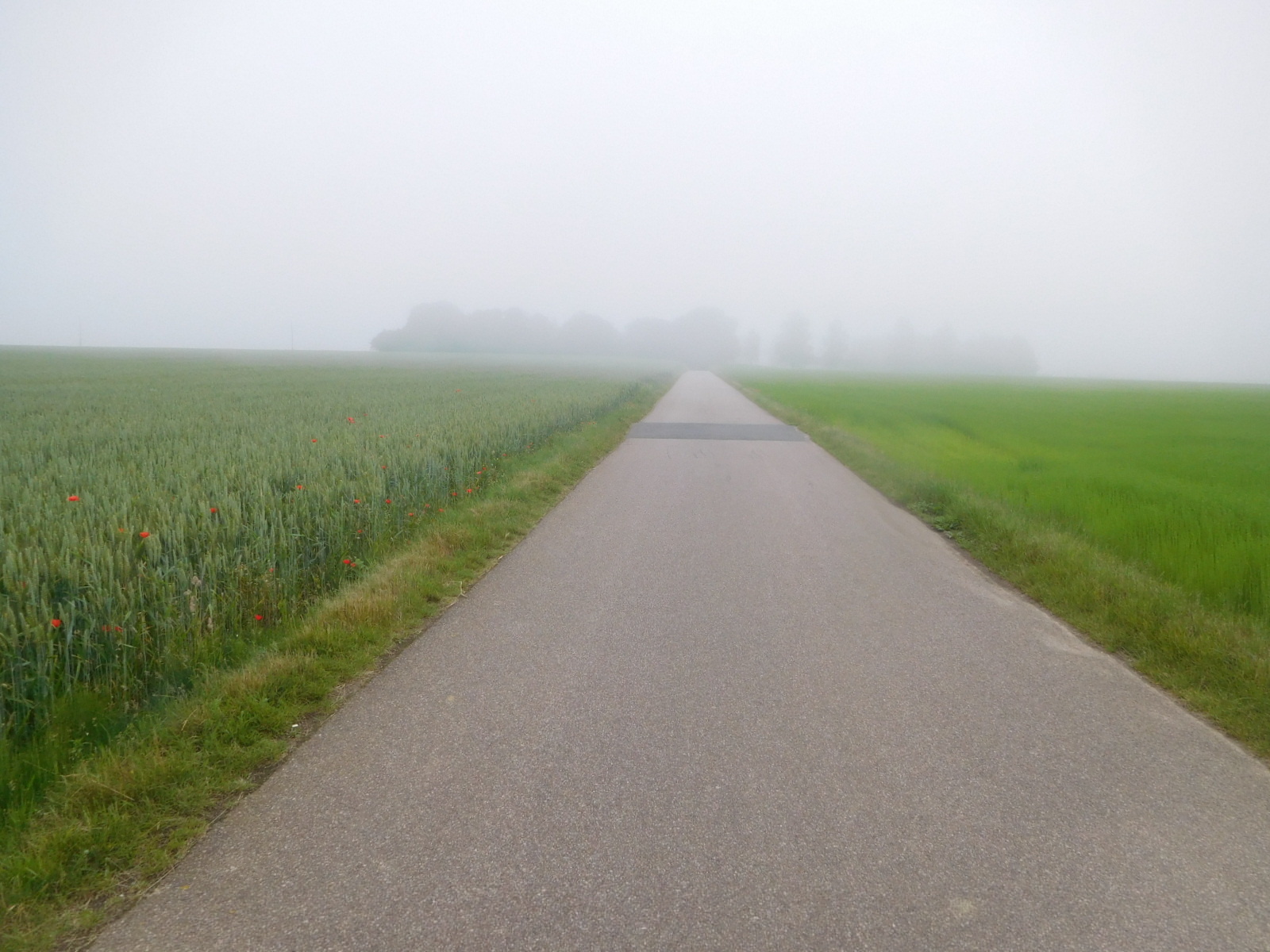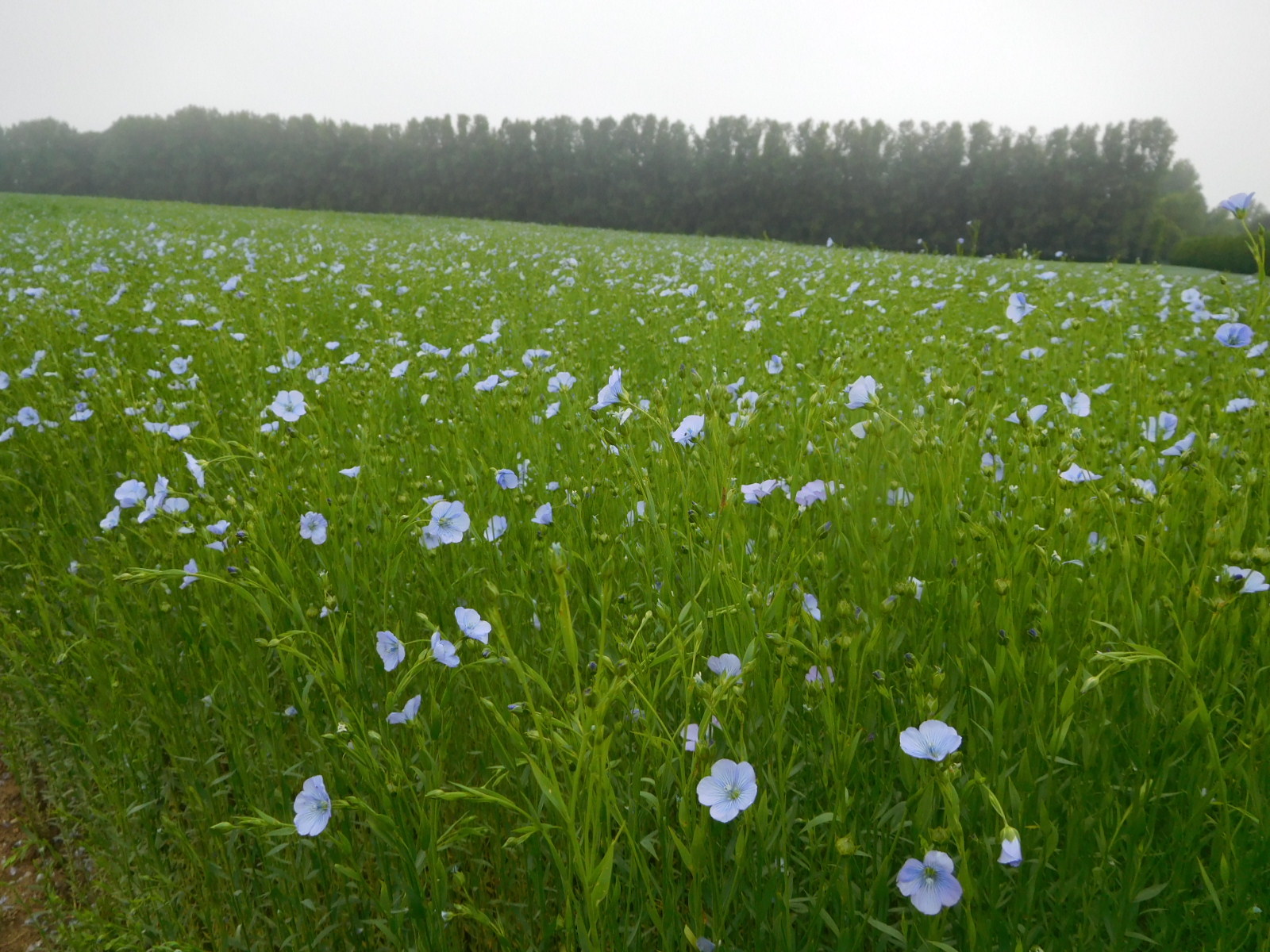 The route fairly effectively kept us away from most smaller towns, so we were free to just pedal through the fields checking on the progress of each type of crop. With heavy mist blowing across the path in front of us, it was a muted, peaceful experience. Two fields we much liked were one with poppies, and one of flax - not yet fully in bloom. Flax in French is "lin", which is the root word for linseed oil, and also lingerie. It's a versatile crop. You can also, of course, put the flax seed in your bread!
