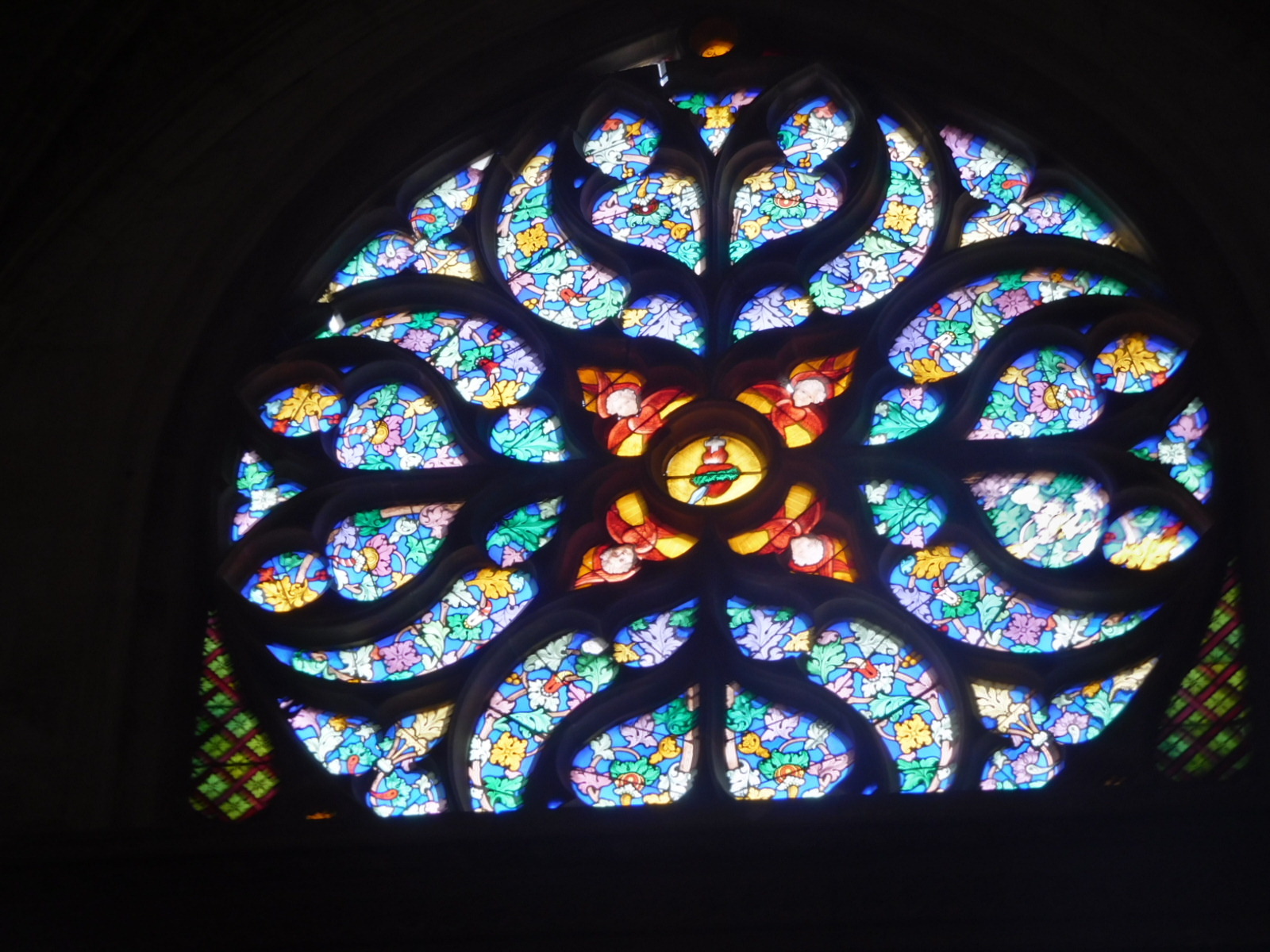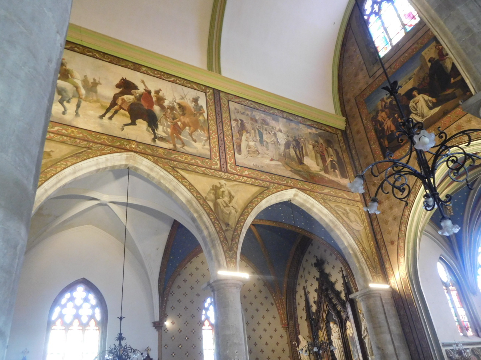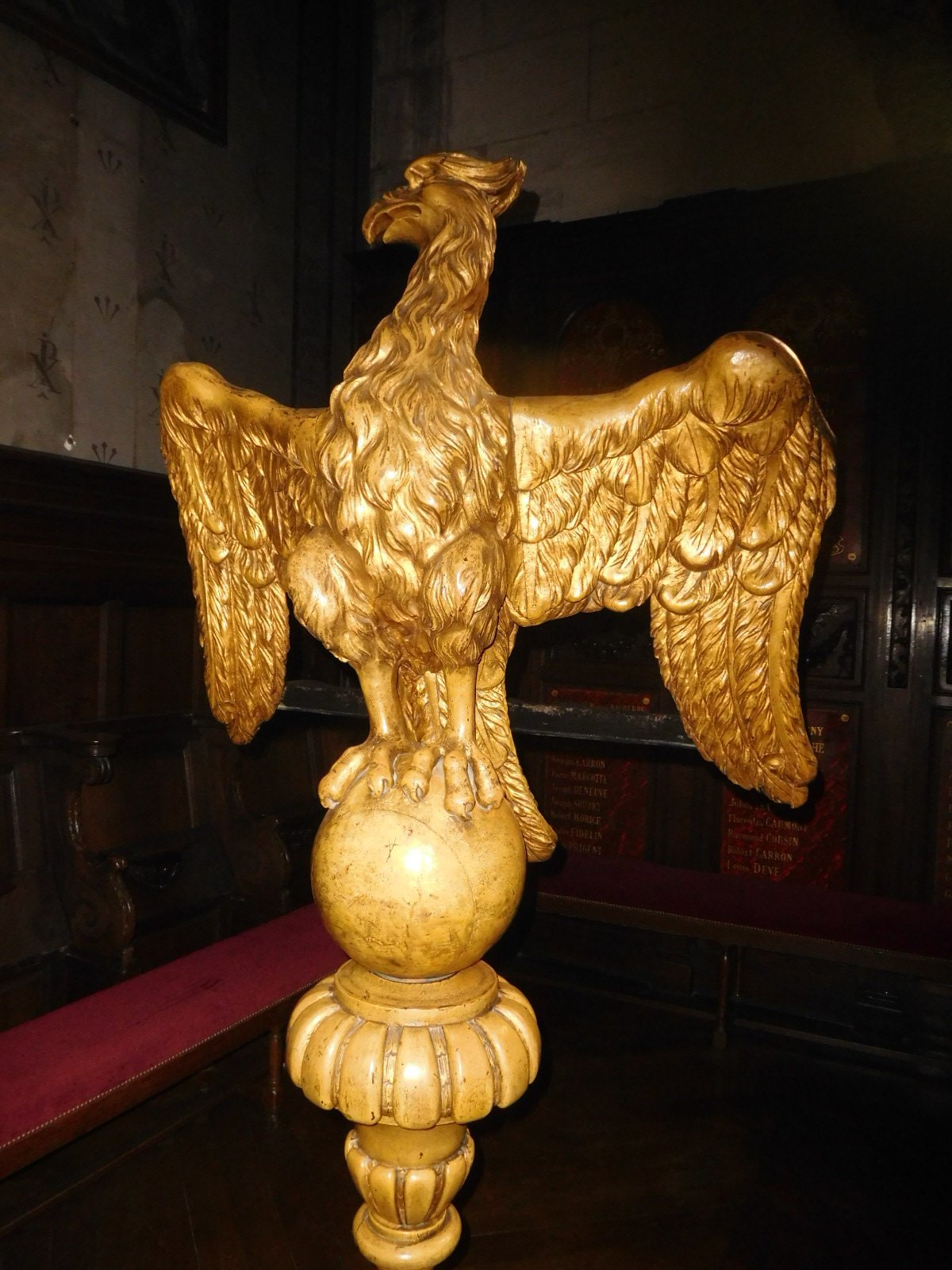 We did visit one of the churches - l'eglise St. Etienne. The main feature here was allegorical frescoes - or actually they were canvases glued to the walls - that had been expertly restored. These were now bright and beautiful. The stained glass also was exceptionally bright. And finally, they had their own golden eagle - or at least golden bird. Naturalist friends, what is this thing?