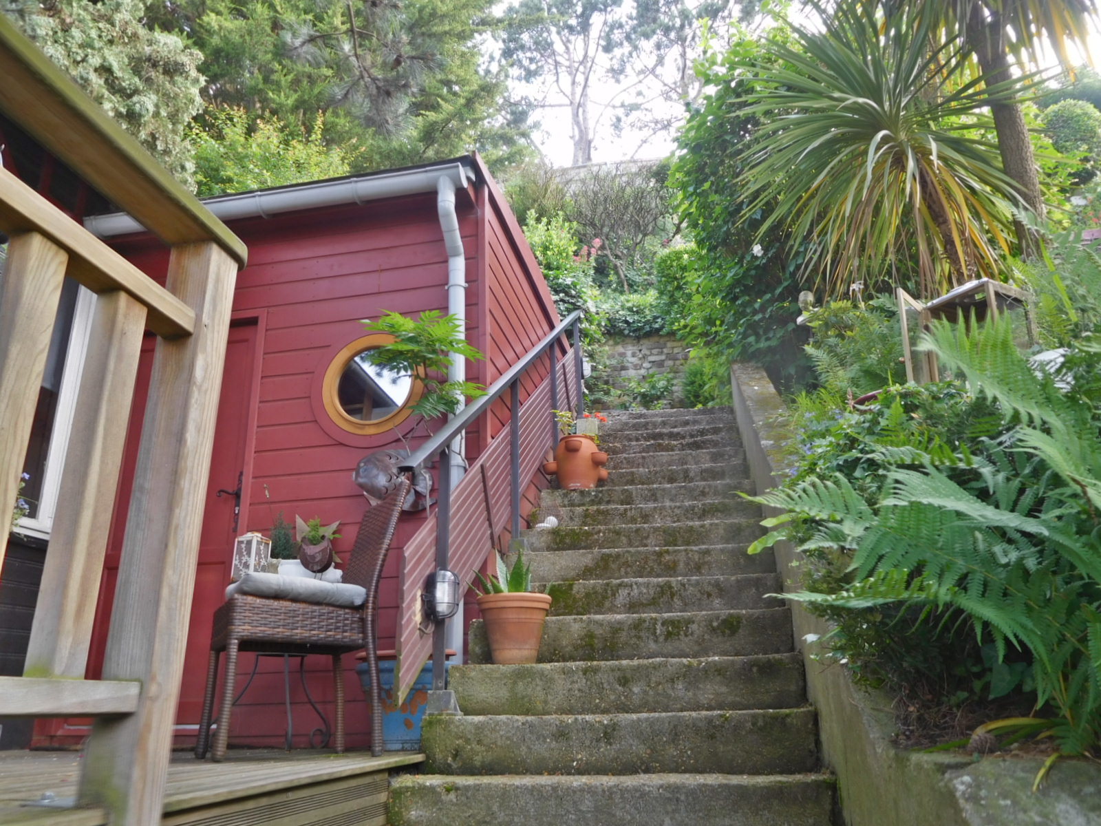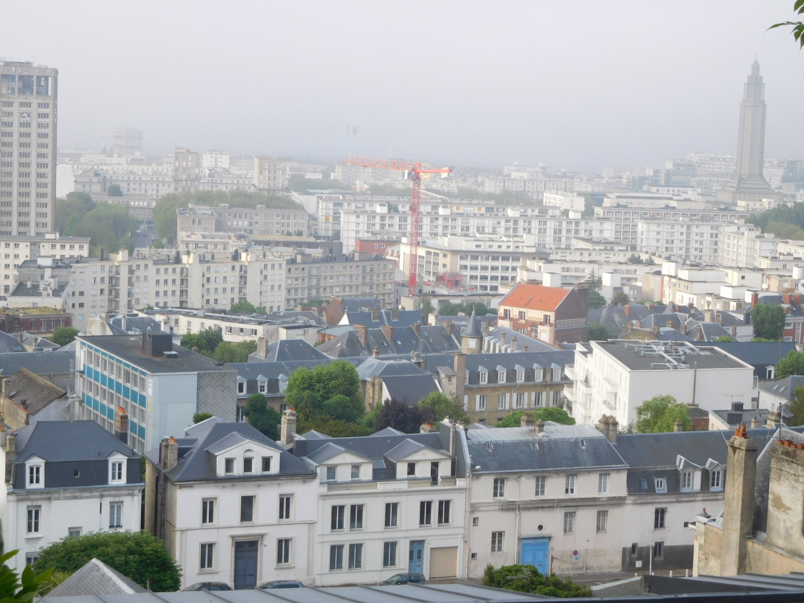 Our little cabin dug into the hillside at Le Havre was really unique, with its steep stairs and terraces on two levels. The views down to Le Havre from the terraces was 180 degrees. It was intriguing to look at and try to figure out Le Havre, which is mostly made from concrete. From up high, the concrete looks sterile, which is actually a form of praise, since riding through the town yesterday the impression was more of grungy.