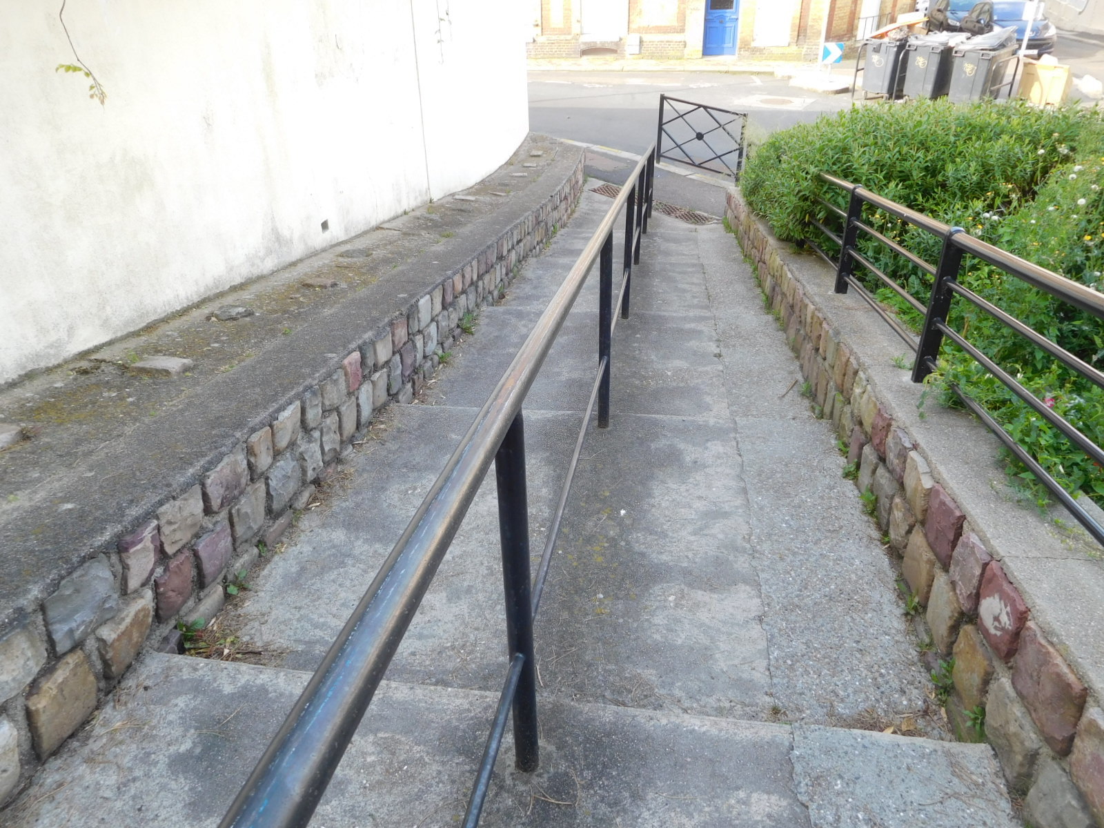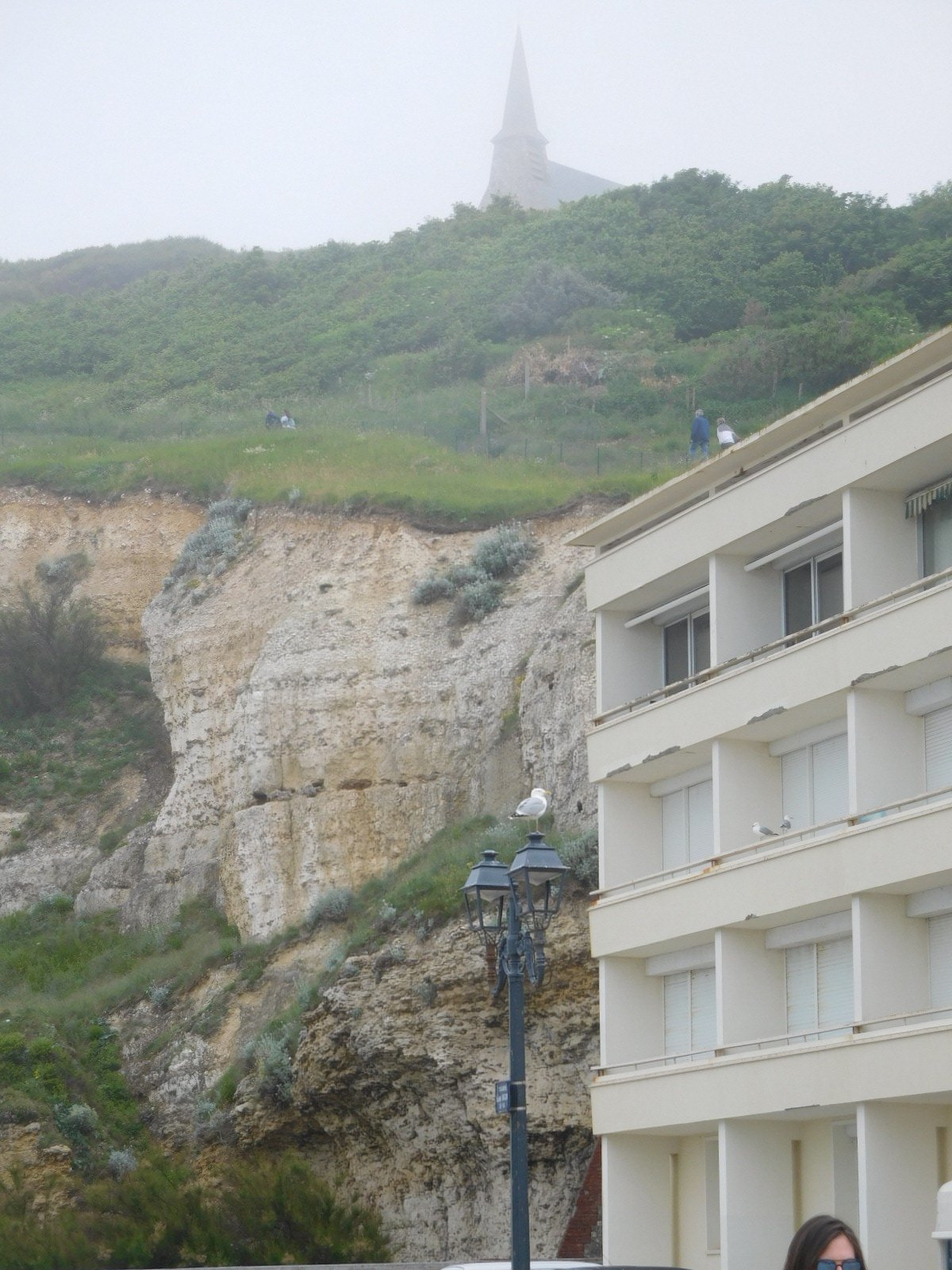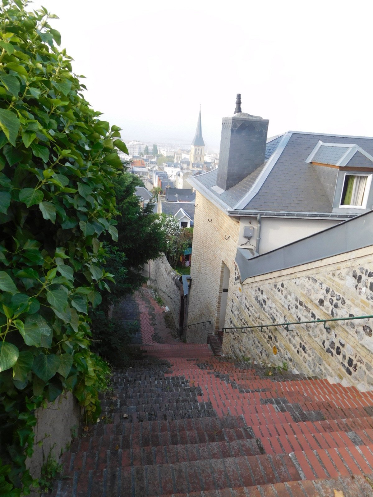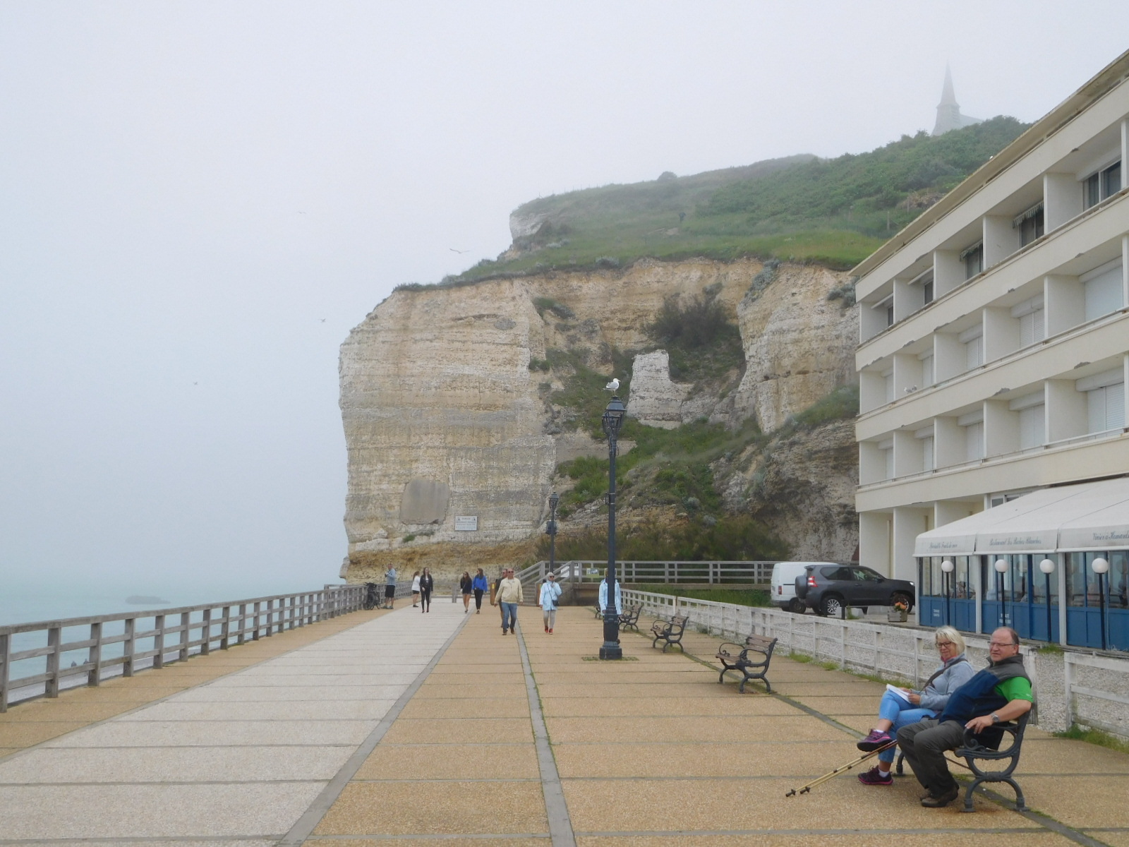 Ok, back to coming around the corner. There was a stretch of boardwalk, with cliffs at either end. Ah, we already knew the drill on this, having just left Etretat. We descended to the boardwalk but immediately noticed that the surrounding ambiance had nowhere near the ambiance of Etretat. Turning one more corner, the reason was apparent. This boardwalk was not the main feature of town but just a little diversion in a relatively large city, that also had a big harbour, several large churches, and a commercial centre that we never even made it to.