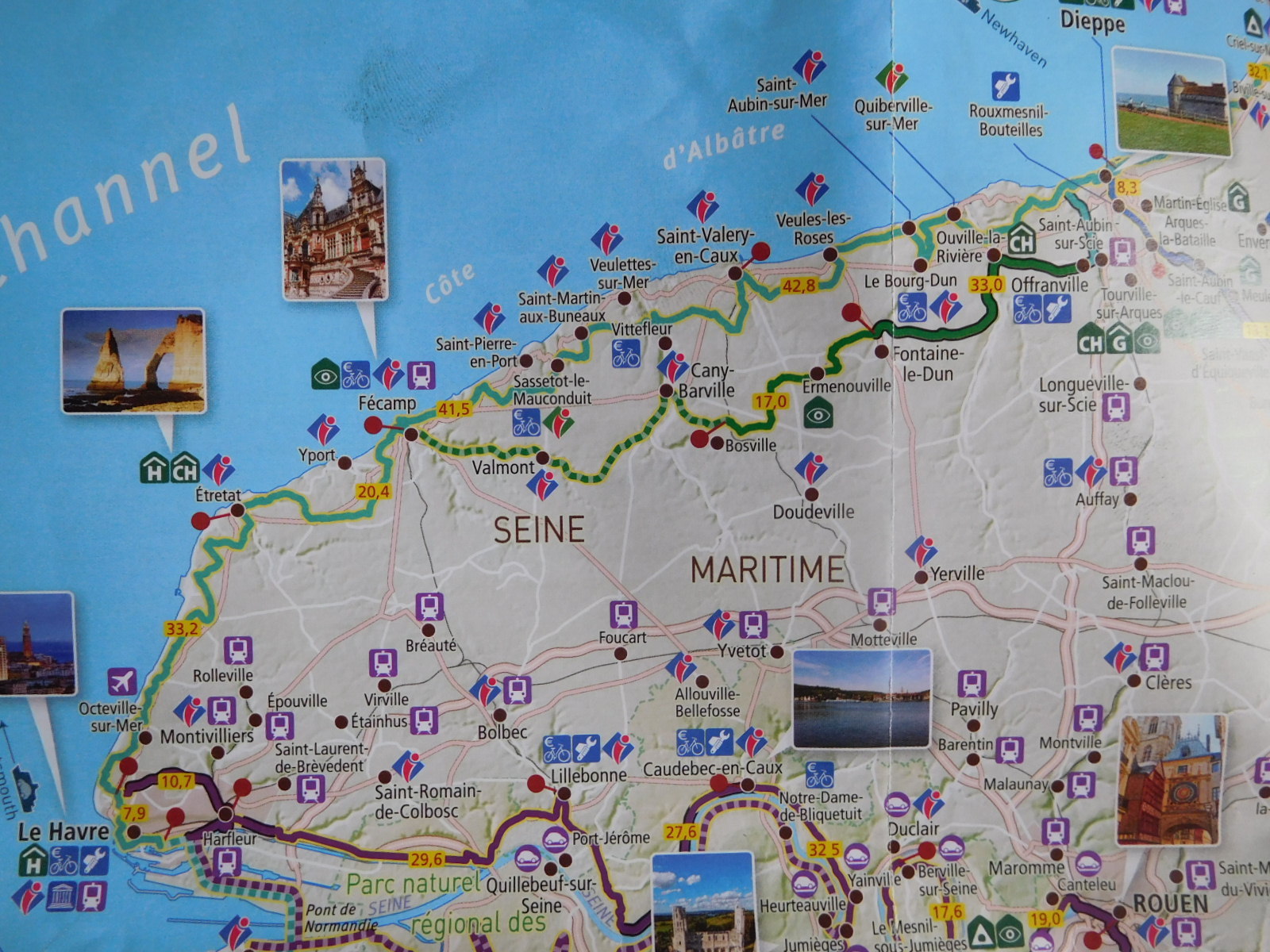 The stretch that we were starting on is called the Alabaster Coast, because it features white cliffs, like the famous ones at Dover, perhaps. It's about 120 km, from Le Havre to Dieppe, and offers 1000 meters of climbing (and descending) if you follow the wiggles to each beach/port community. Here is what it looks like on a map: