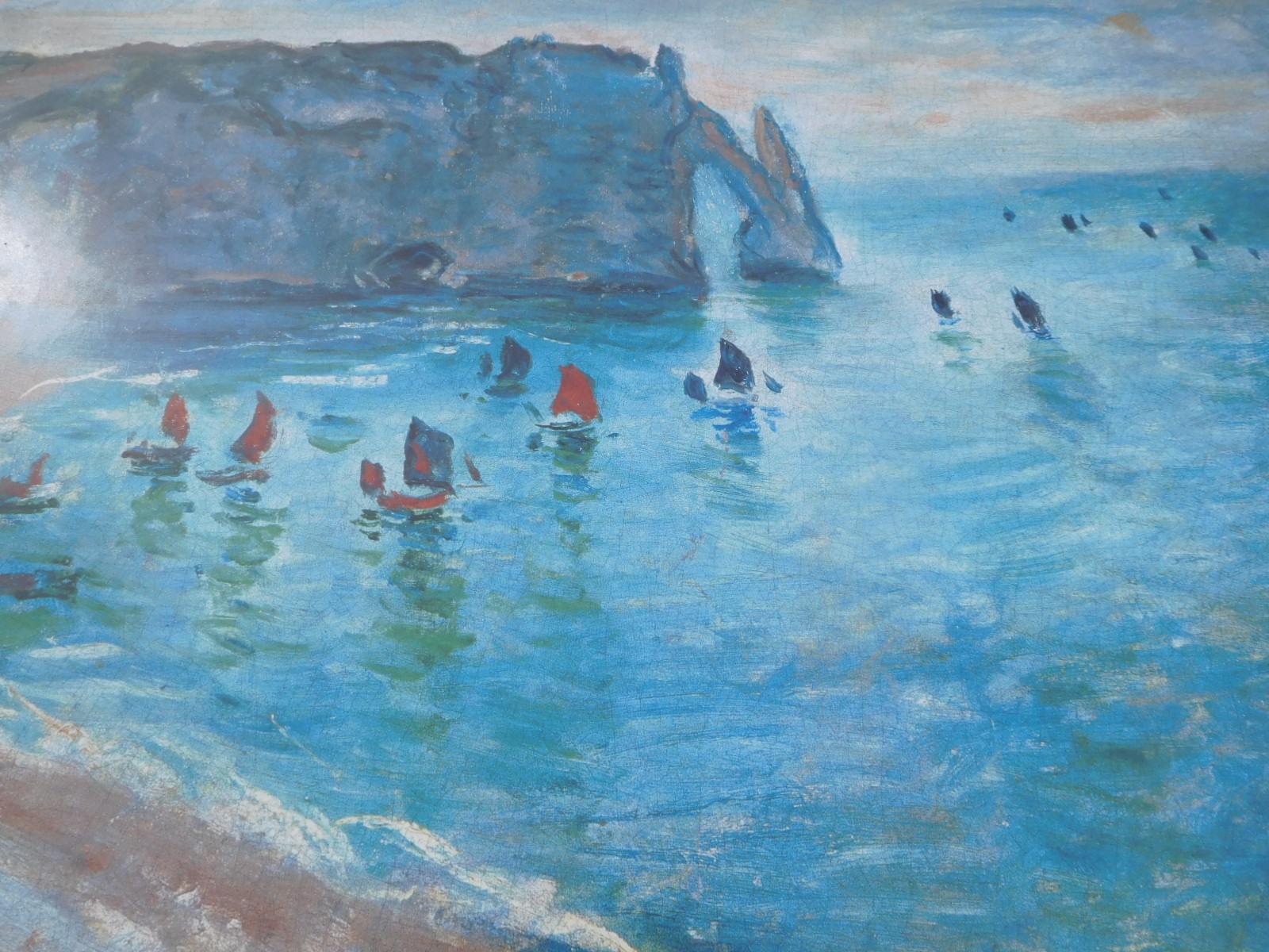 Those are the basic charms of Etretat, but it is also famous. Claude Monet loved Etretat and made many paintings of it. One of these is at each end of the boardwalk, where you can look directly at the same scene that Monet was painting. With the mist, the cliffs were very muted for me. But I think my photo rivals Monet's painting!