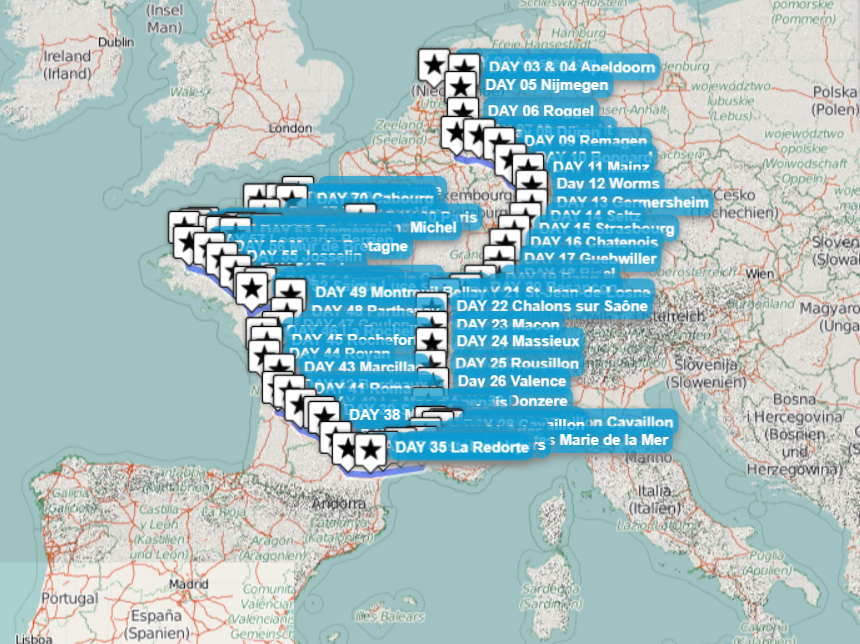Our friend Michel has been tracking us on GPSies. The basic map comes out quite artistic, we think: