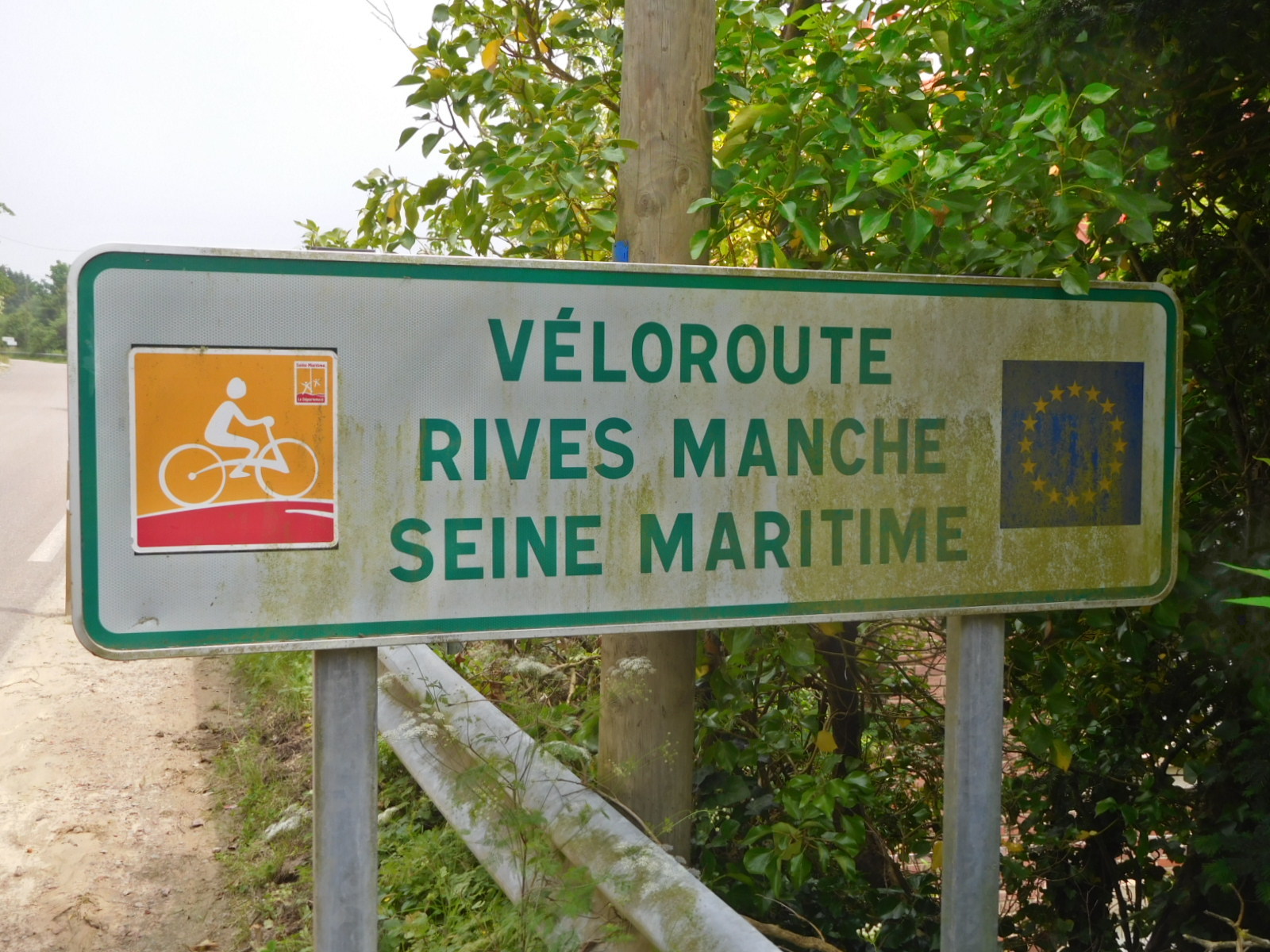 Coming out of Le Havre, the Seine Maritime department was offering us a bikeway that they call Veloroute Rives Manche. This would nominally be part of EV 4. The directional signs for this are a white cyclist on an orange background. Because of Le Havre, we were leery of trusting anyone's route signs, but Seine Maritime turned out to be serious, and we were able to follow these all day.