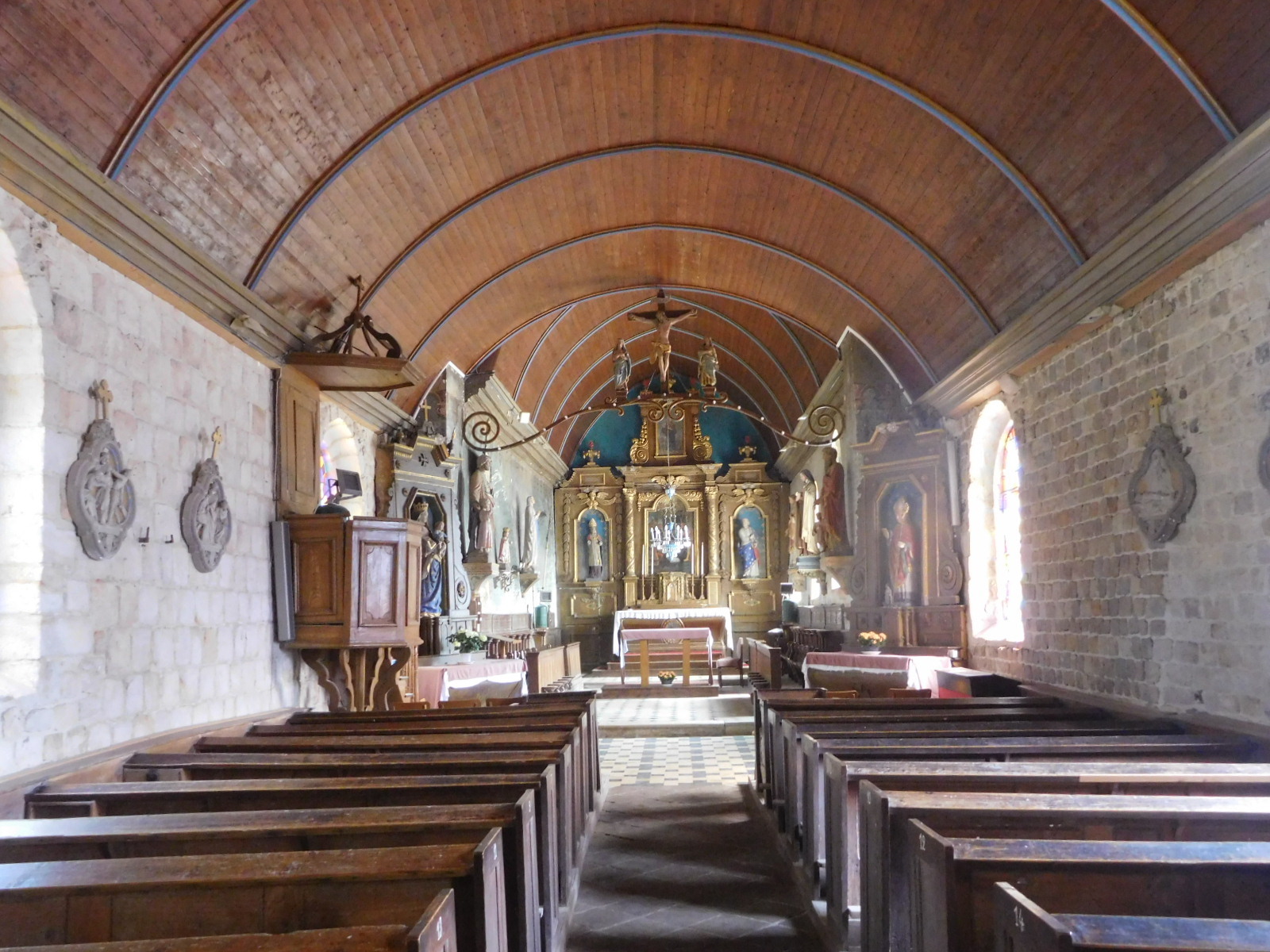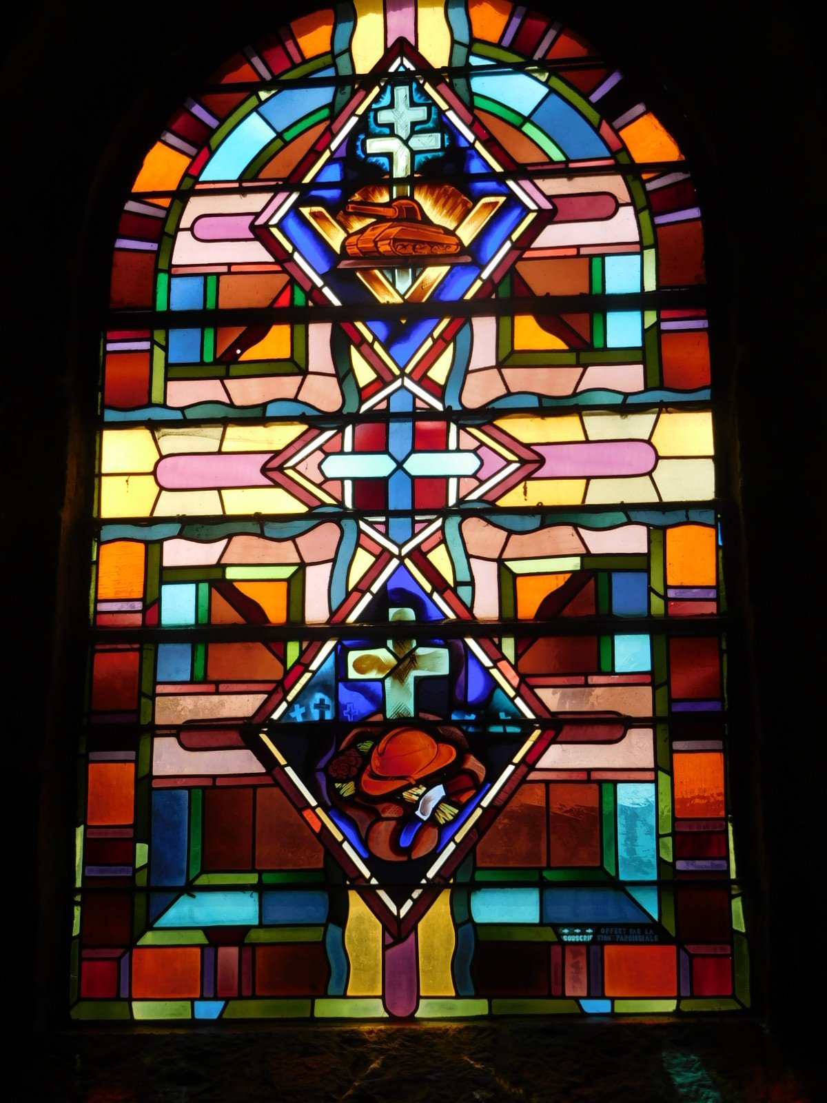 Inside the church at Dorsay we found the now familiar barrel vault ceiling. Also, in the stained glass, added to the usual heroic and mythical representations there was a world war related panel. Fair enough. What seems more or less current to us now will soon enough be ancient history.