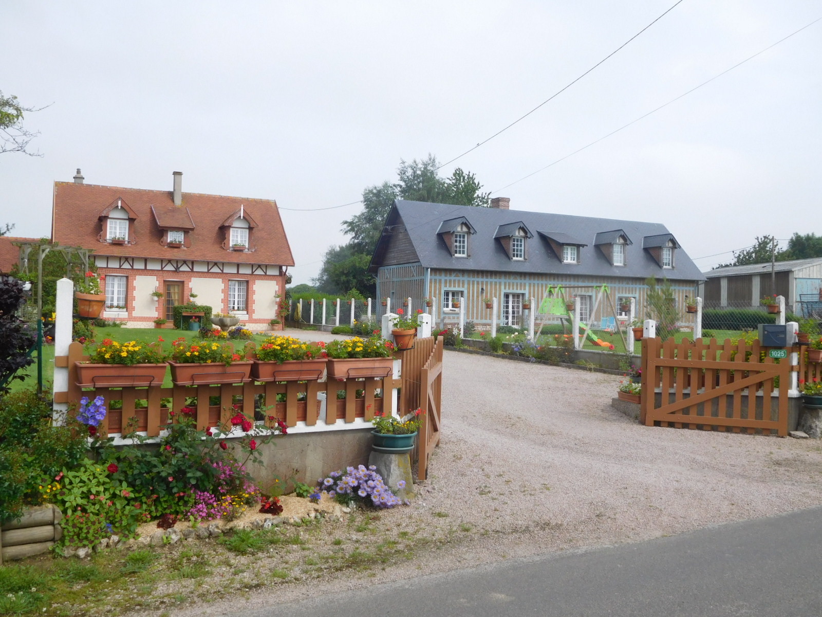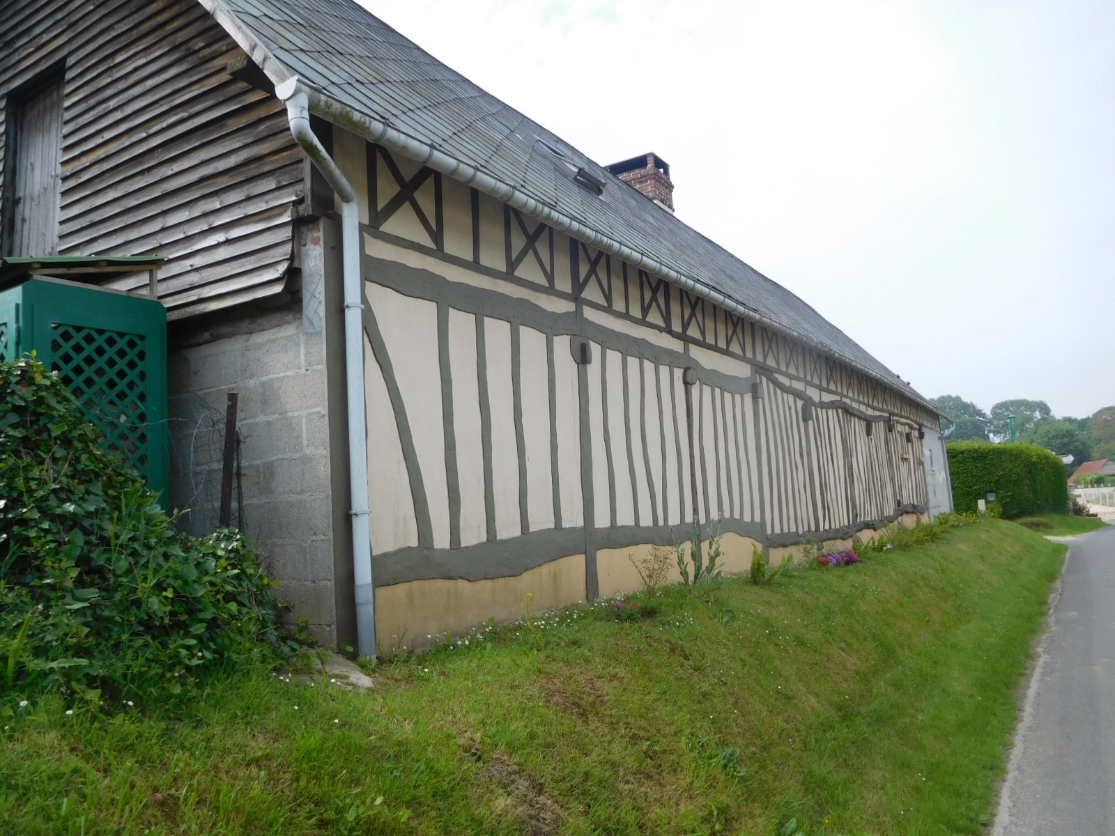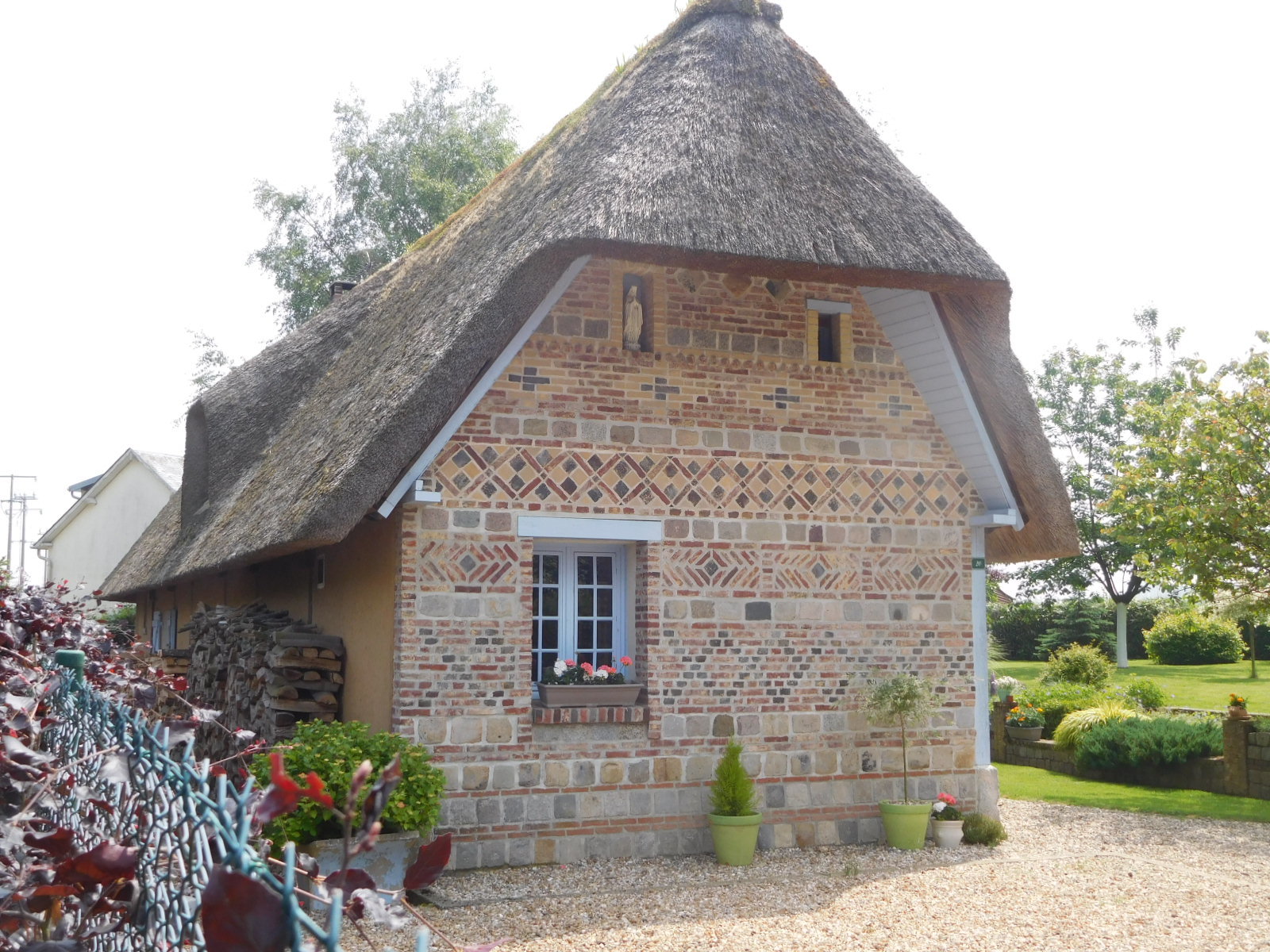 Of course it is not just the colour of crops that catches our attention, there is, as always, cows and buildings. Today we saw small groups mainly of Normande cows which are the loveliest, but also caramel ones, black and white, all white, and even red. With buildings, we continued to see a lot of flint in the walls, plus very decorative use of brick. Thatched roofs are making more of and appearance, as are half timbers. There are some with exposed vertical timbers, which we have not seen before. Thatched roof - half timber is an iconic Norman style that we could probably find on postcards.