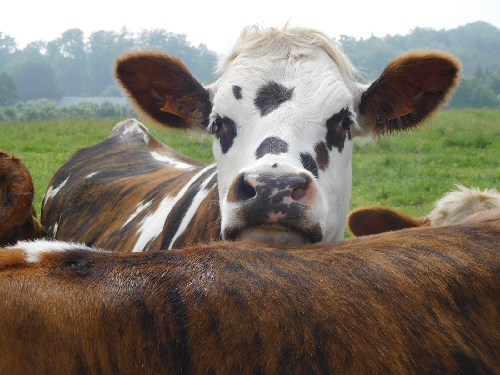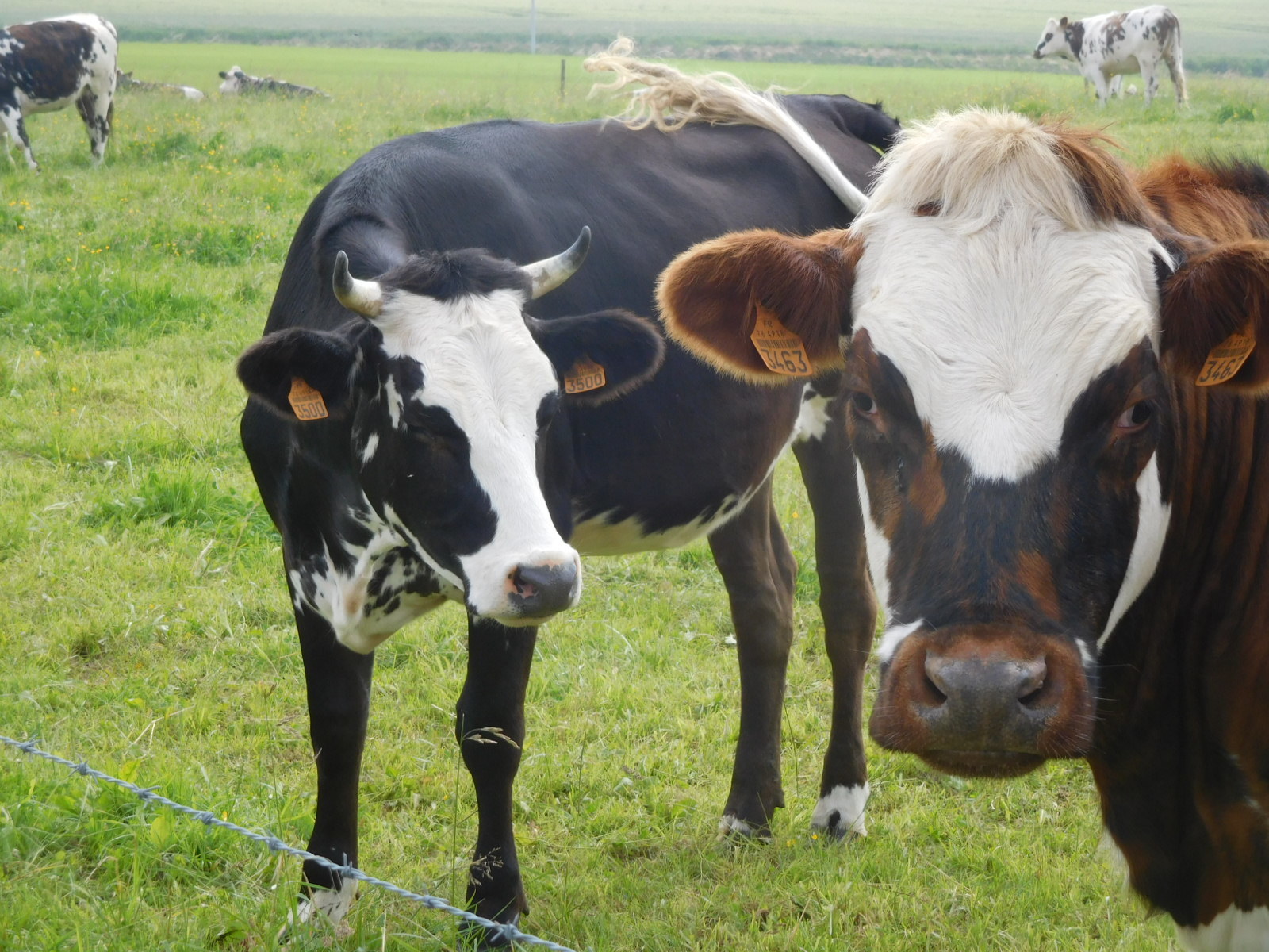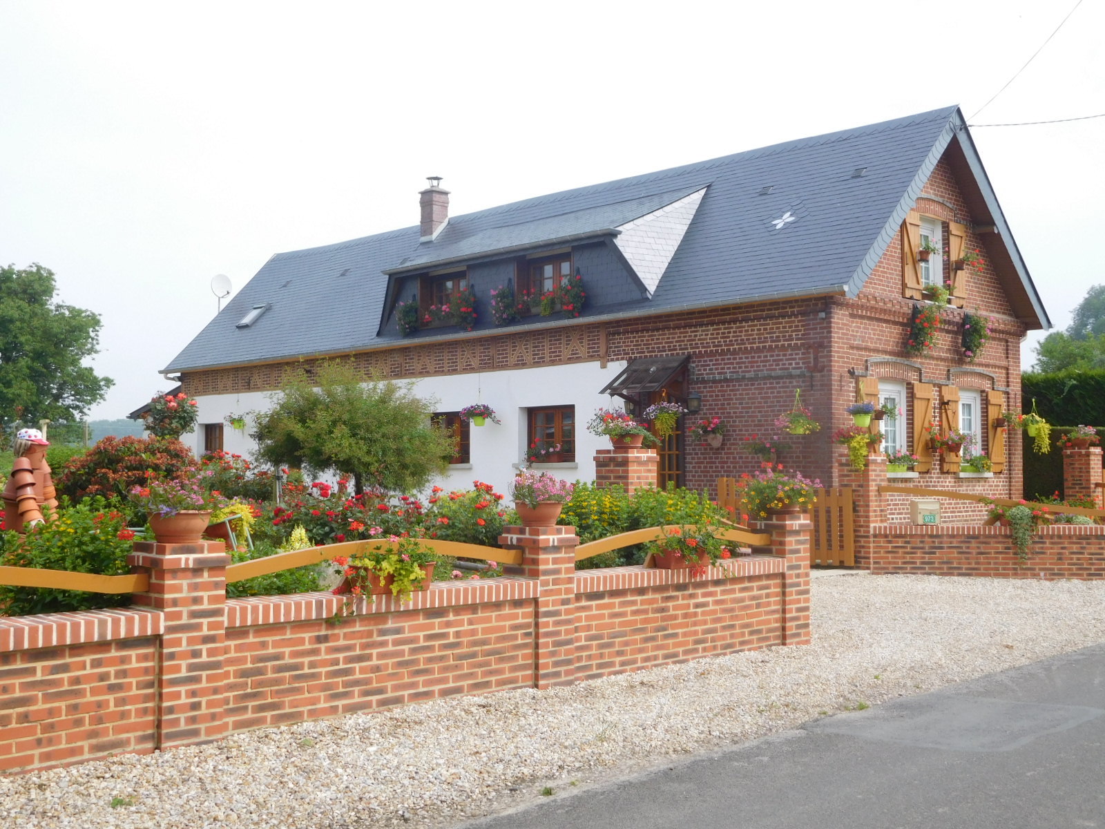 Of course it is not just the colour of crops that catches our attention, there is, as always, cows and buildings. Today we saw small groups mainly of Normande cows which are the loveliest, but also caramel ones, black and white, all white, and even red. With buildings, we continued to see a lot of flint in the walls, plus very decorative use of brick. Thatched roofs are making more of and appearance, as are half timbers. There are some with exposed vertical timbers, which we have not seen before. Thatched roof - half timber is an iconic Norman style that we could probably find on postcards.
