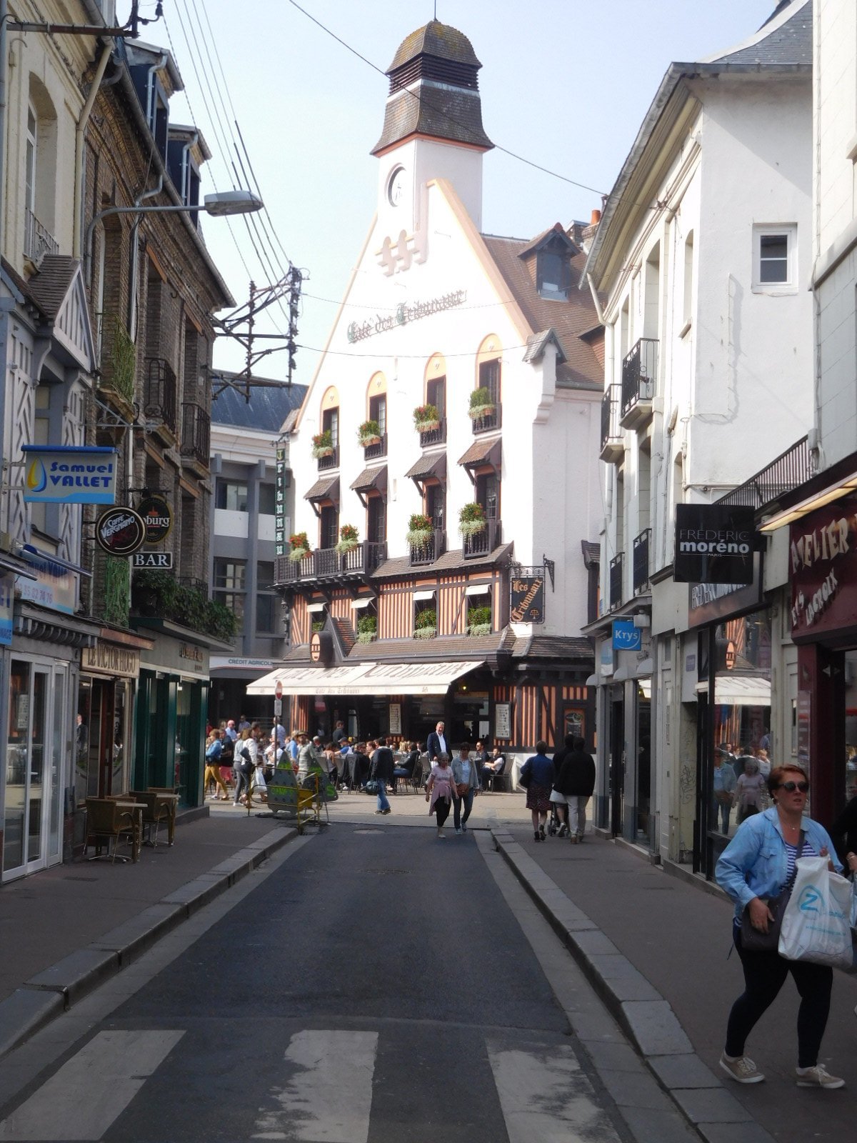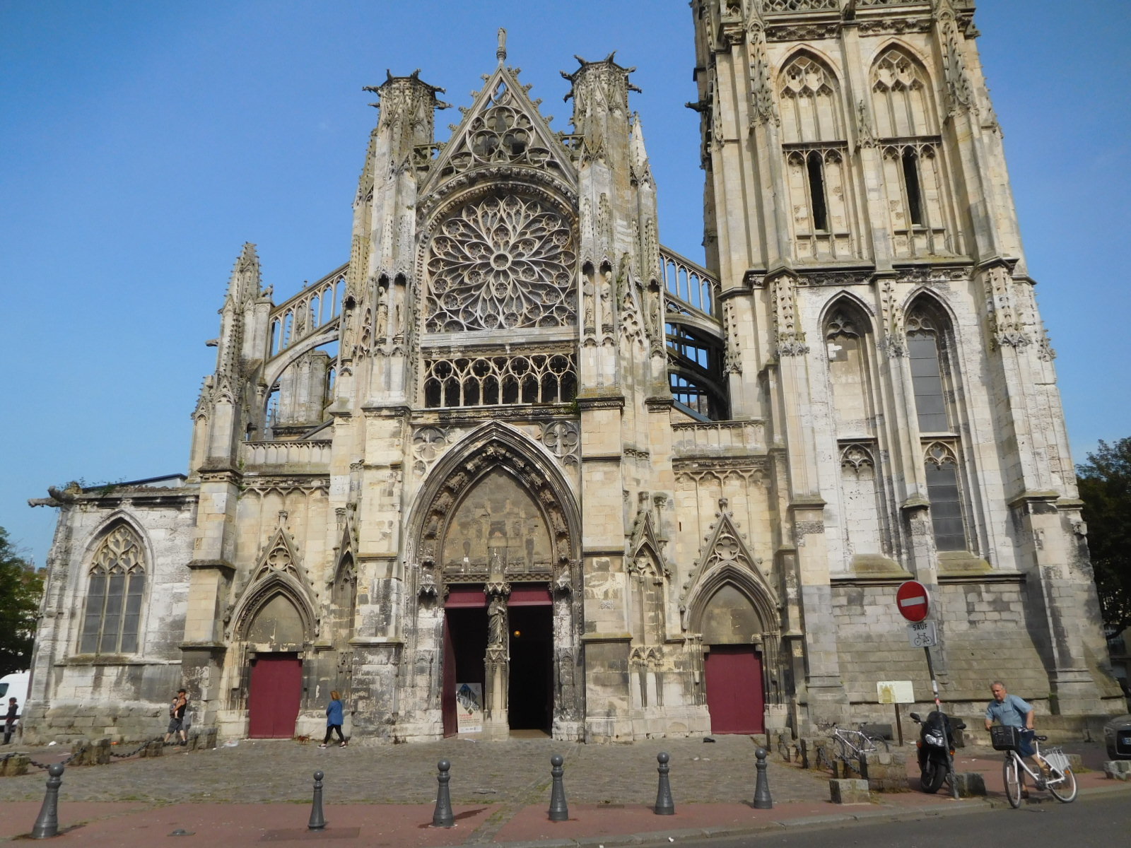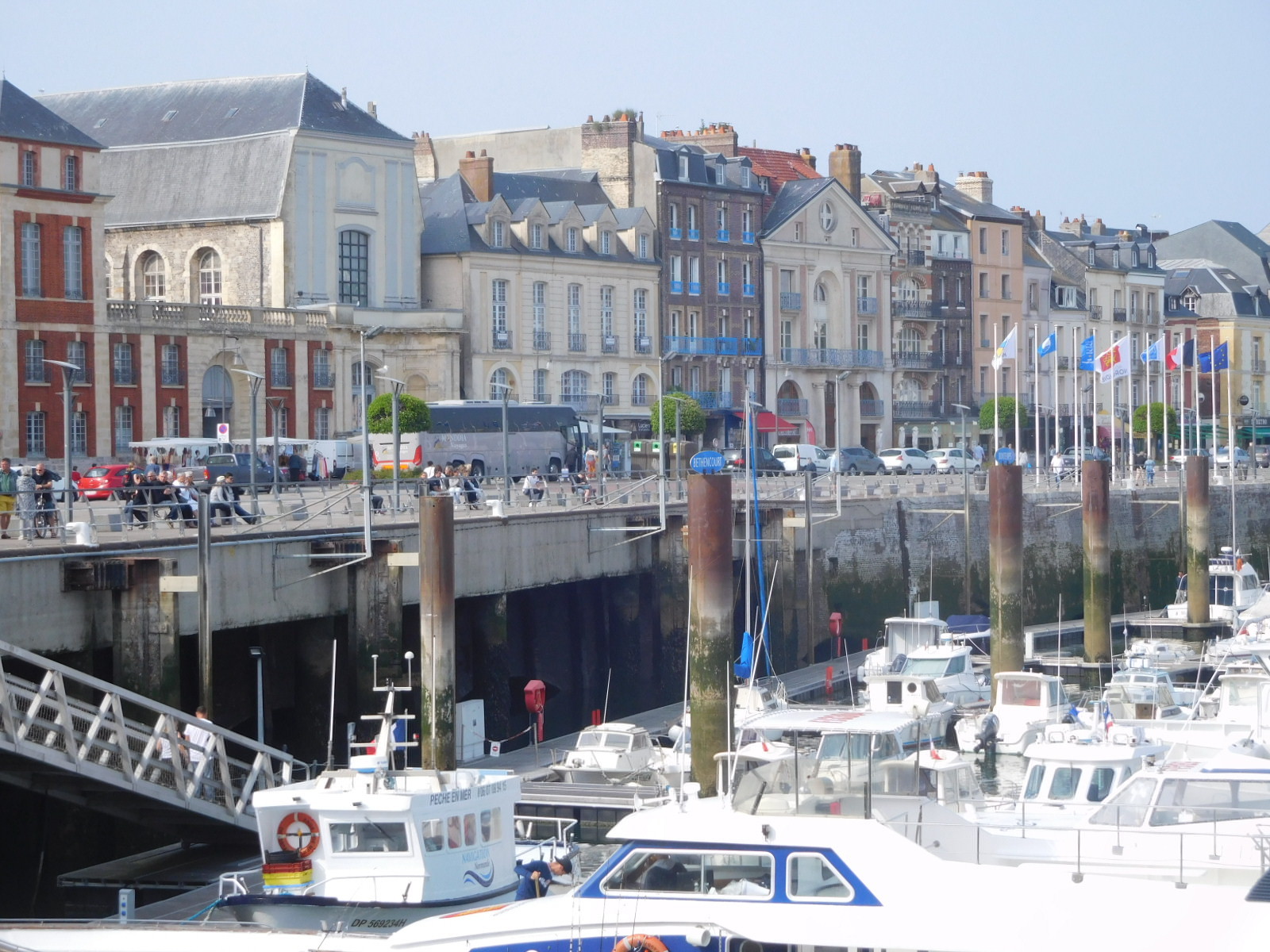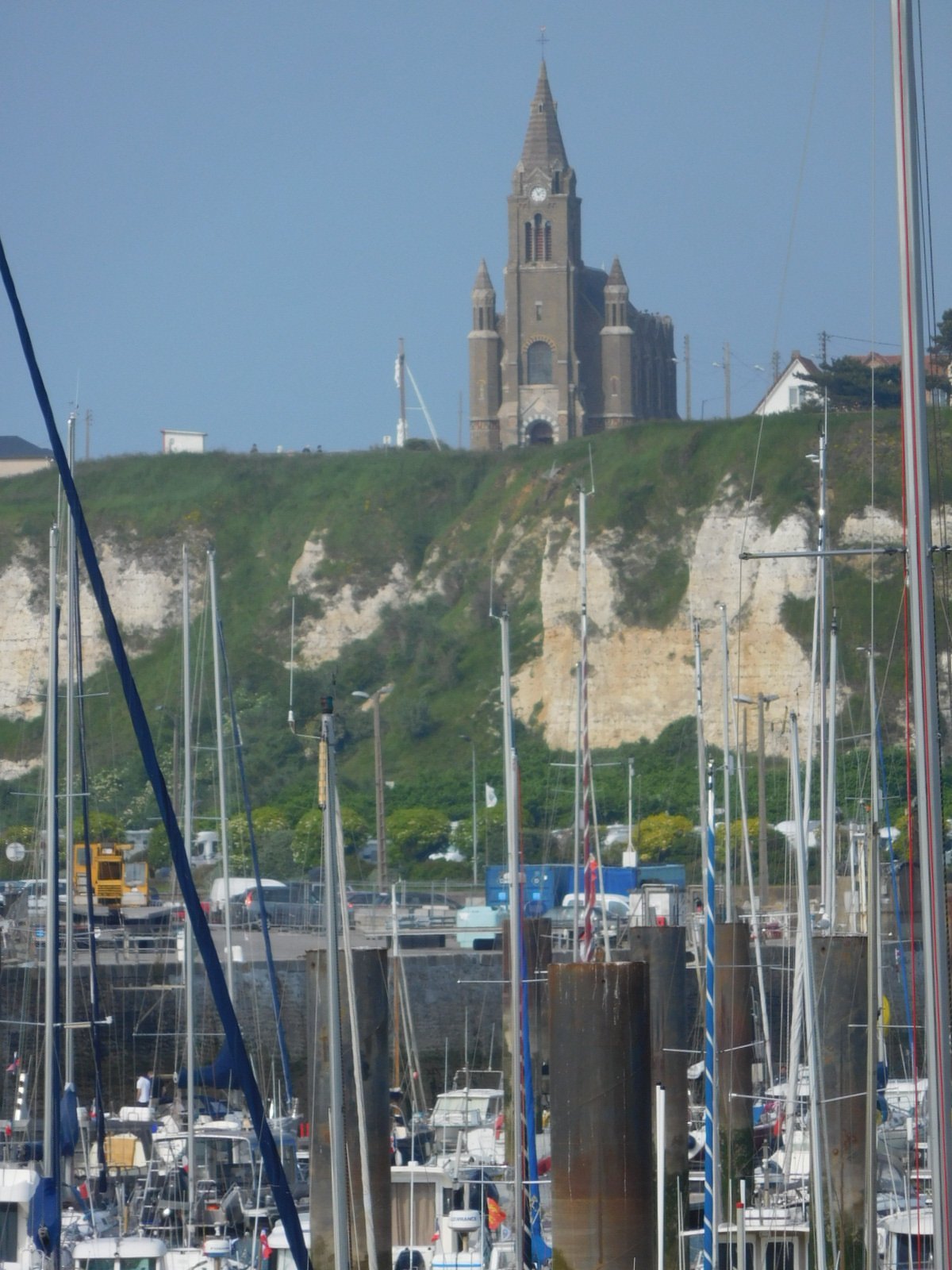 We continued climbing over the ridge and descended into Dieppe, following the "Avenue des Canadiens". While still at some height we got a peek down and it seemed like we were looking at another Le Havre. Oh, oh. We reached our hotel the "Egg Hotel" easily and directly - nothing like Le Havre. Our bikes went to their room and we went to ours, and the day could have ended there. But I thought I should go out for a peek and see if this truly was Le Havre or not. Leaving Dodie to nurse her knees (actually, just to put up with them) I zoomed out and was quickly surprised to find interesting buildings, a cafe scene, a lovely harbour, and a cathedral. Not Le Havre at all. Hooray. Tomorrow on the bikes, Dodie will see it too. For now, both she and any readers can have a look through my camera: