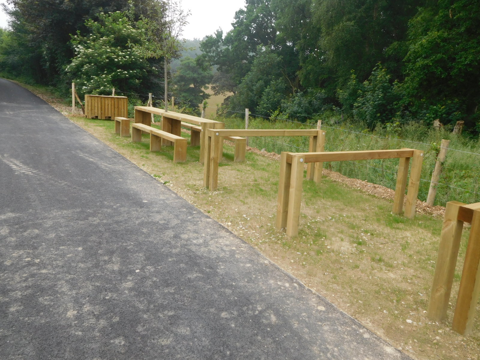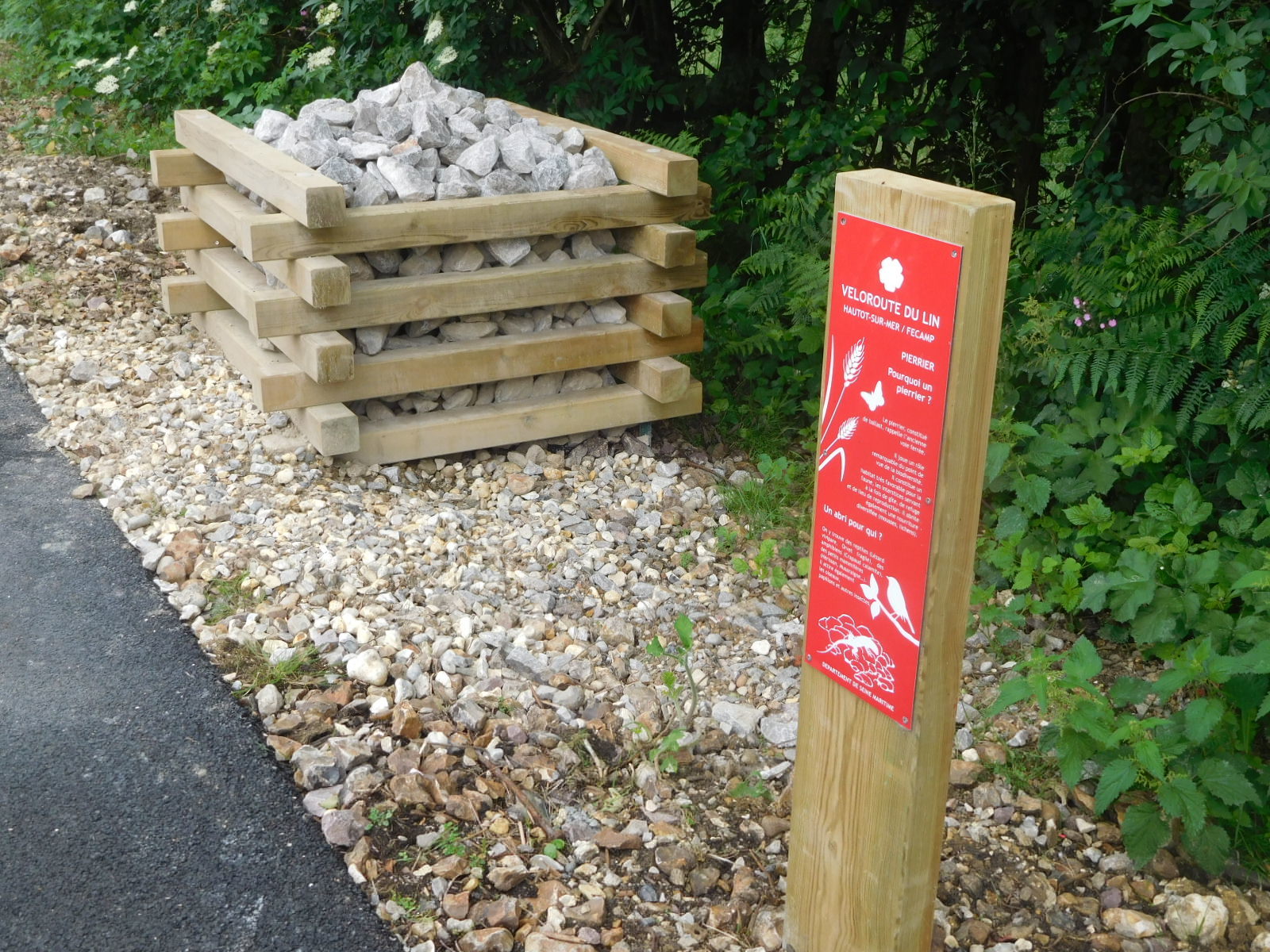 The Veloroute du Lin is brand new. In fact it is scheduled for completion "Summer 2018" and we did find lots of work to be done. But still it was fine, more than fine. It's a rail trail, 70 km long, running from Fecamp to Dieppe. The paving is new and smooth as can be, but it has other very pleasing attributes. It seems logical and what else would you expect, but all the design elements are consistent right the way along. I am talking about the blue crosswalk paint, the design of the crosswalk barriers - all in lovely cedar, the signage, the painting of upcoming town names and distances on the asphalt, the periodic all cedar rest areas with tables and garbage, etc. To be sure, there turned out to be several quite long stretches where the trail has yet to be developed. But for these, excellent signage put us on very small and quiet roads that in some cases were just as good as the trail itself would be. And sure enough, 70 kms later we were delivered to Pourville, just beside Dieppe, where the Veloroute du Lin intersects with the older, hillier, coast route.