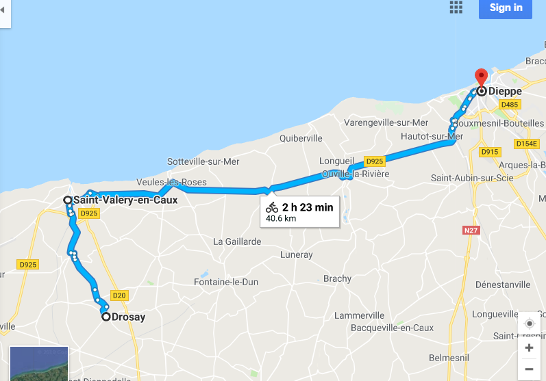 These facts are good to have in mind to appreciate what happened next with us. We were cycling along from from Drosay. Drosay is a town inland from St Valerie en Caux. Stay with me now. Here are these towns on a map: