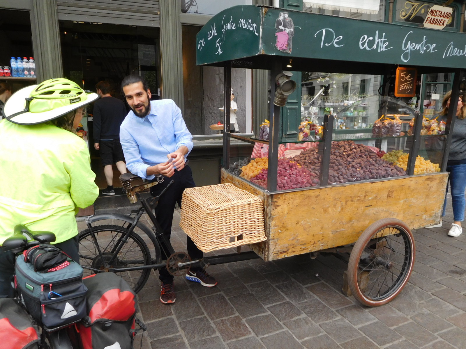 Ghent has lots of cobblestone walking streets, with cafes and shops. We ran into one with an outdoor cart at which were being sold "Ghent Noses". This is a Belgian candy mad with gum arabic and raspberry flavoured. It is shaped like a cone or nose and has a chewy exterior and gooey interior. This is a legitimate Ghent specialty and dates from the late 19th century. In talking to the man selling from the cart we found he was local, having been born at the maternity home behind the castle.