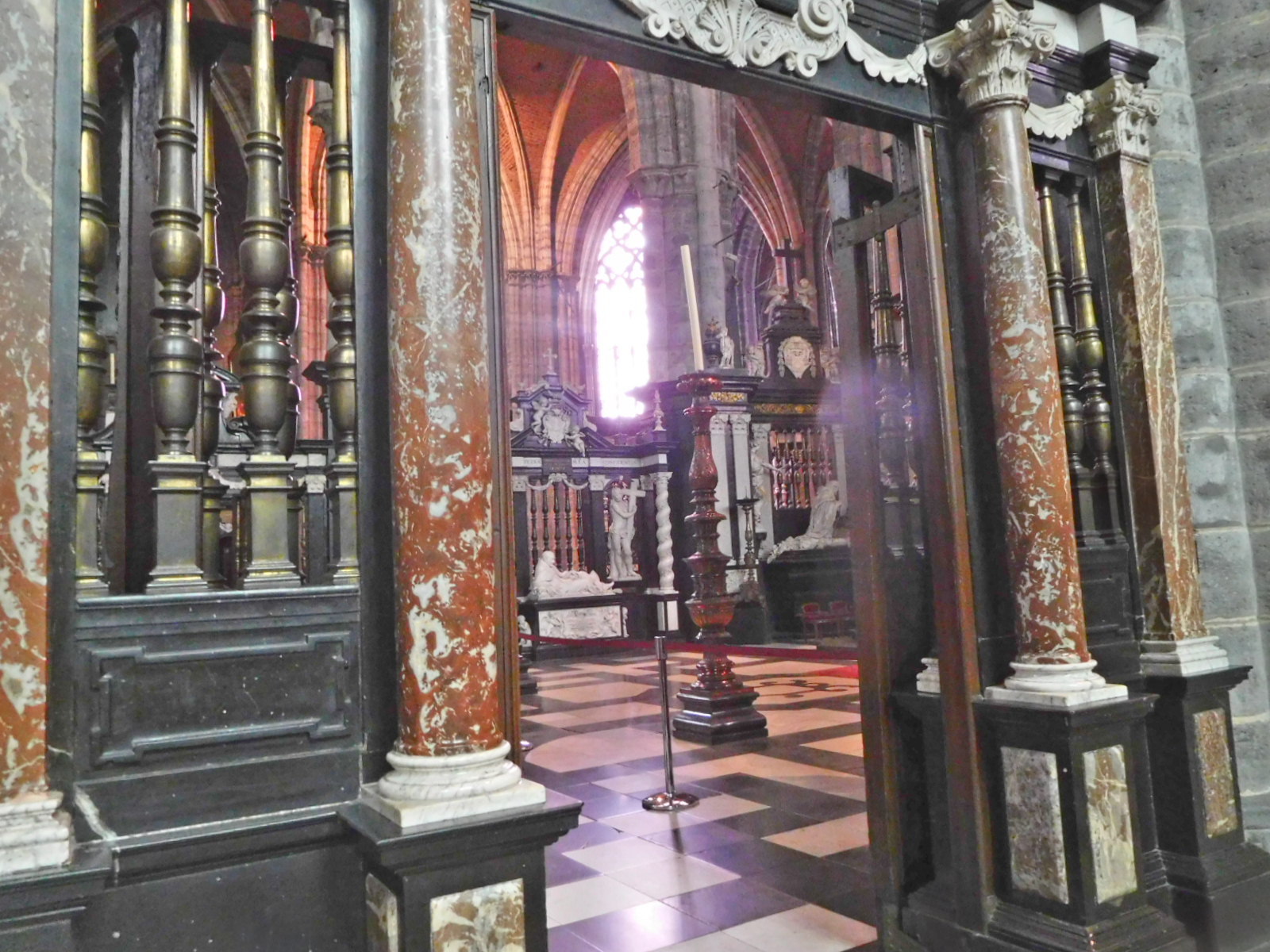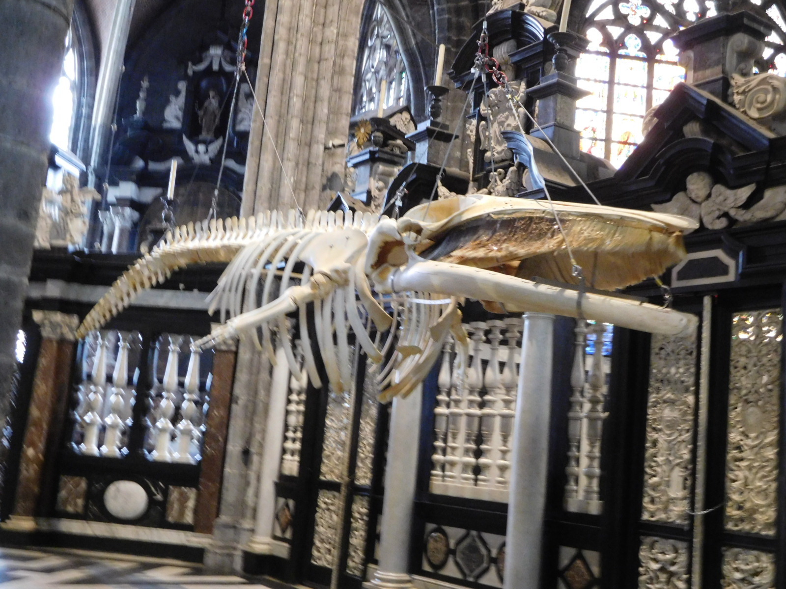 The cathedral was the type of church that has very many side chapels, and ones around behind the altar. Back there was also a very surprising relic - a whale, or at least a whale skeleton. It made me think they were really pulling out all the stops to impress people, as if their statuary were not enough. In fact it was an unusual nod to science,. The whale had washed up in Ghent harbour and the university had prepared the skeleton. Somehow the church then agreed to hang it. Of course, they are still using it to teach about Jonah and the Whale. That kind of defeats the nod to science, since Jonah was supposedly swallowed by a whale (technically, a "big fish") and survived three days inside before being vomited out to continue his evangelical work at Nineveh.