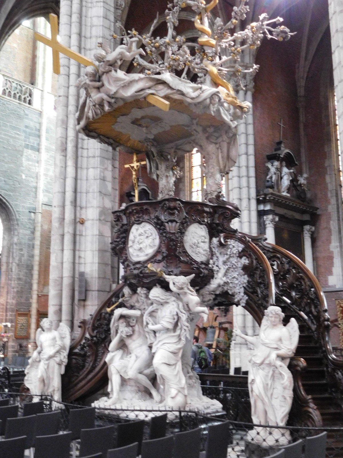 We rolled into the core of Ghent, and were immediately struck by the many towers and fancy buildings. One of the towers, of course, belonged to the cathedral, which is called Saint Bavo's. This church features lots of impressive statuary, and a really elaborate pulpit. A pulpit like that would come in handy for trying to impress anyone with your speech. It's a technology maybe politicians should try.
