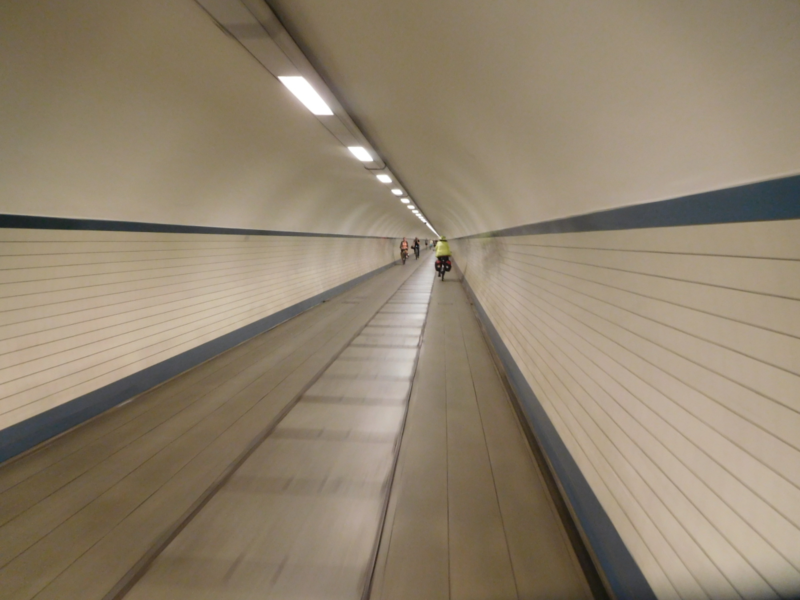 To cross the Scheldt, we used the Sint Anna pedestrian/cycle tunnel. This was constructed in 1933, and still has a wooden escalator (plus an added elevator for bikes). You go down in the elevator, then through the tunnel, and back up. The buildings on either end are nondescript and not really marked. Yet this is a super cool feature of the city.