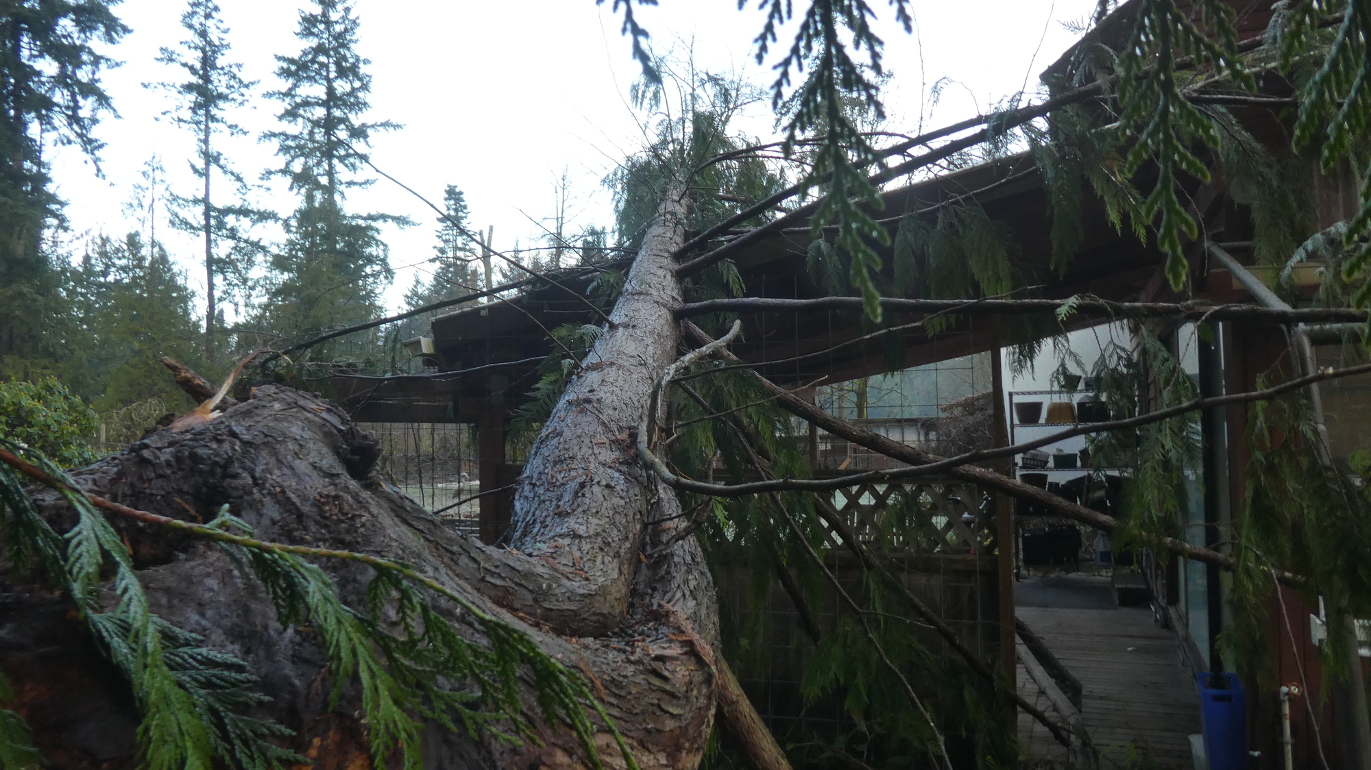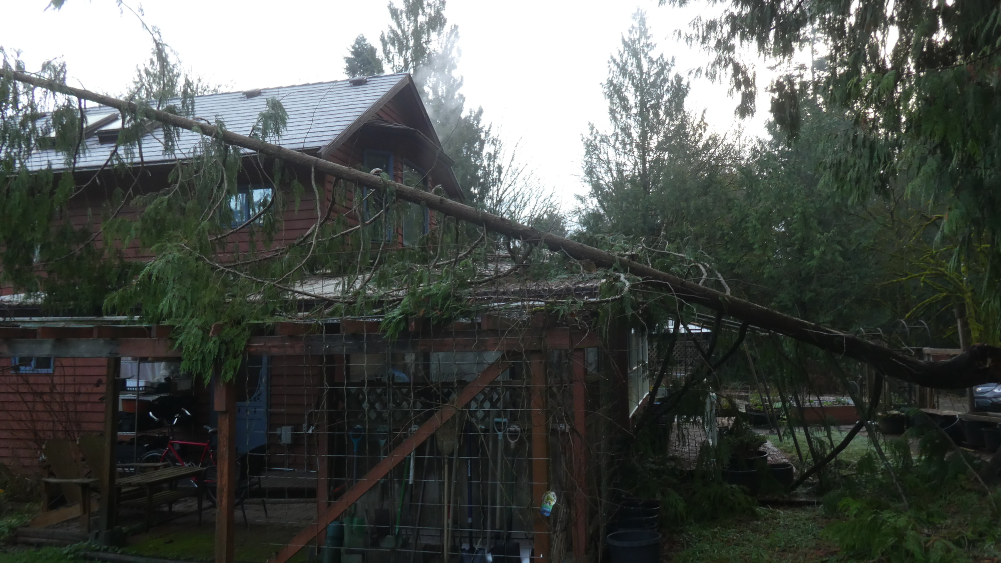 But the rain (probably) had another effect. It took down a branch (or spur, really) of the moderately sized cedar tree that grows by the house. This crashed onto the roof of the covered patio where we have our BBQ. This roof was built by - us! - and is darn strong. It survived the crash. This gave me a chance to try out my new Chinese chainsaw and to generally figure out how to get the tree off the roof. The saw worked great, but was rather heavy for cutting over your head. "Cutting over your head?!", Steve, you really must be looking for a way to avoid this next trip!