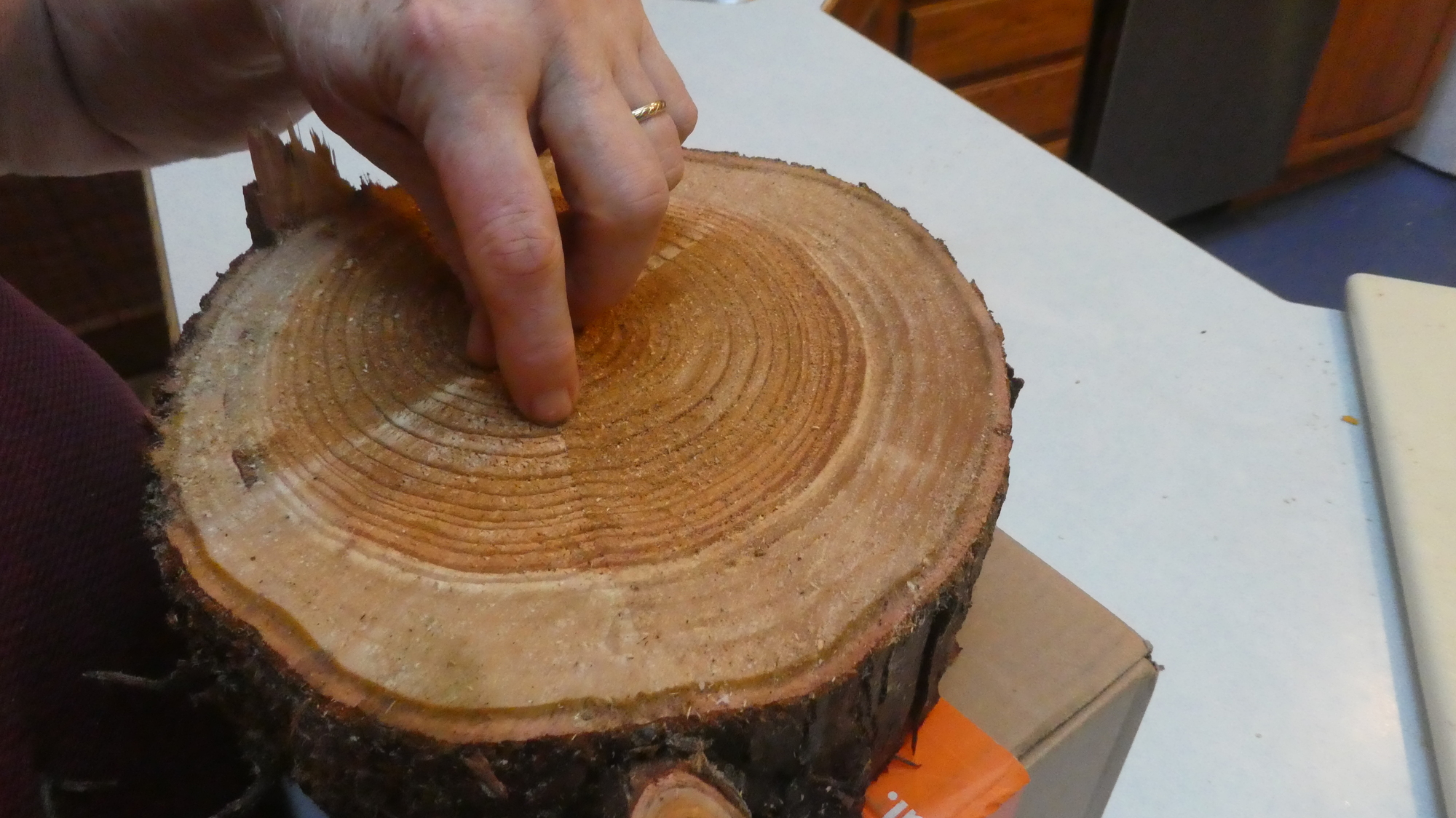 Twenty or thirty years ago, this same tree had a shot at our two girls, whose bedroom was in the second story, just behind where you see the fallen tree piece in the photo above. We don't remember if their window was broken at that time, but they were ok. Now, counting rings (below), it looks like this piece grew since the tree took its last shot (about 30 years). So maybe we are ok now for another 30 years. We would hate to cut down this lovely cedar, just for its occasional indiscretions!