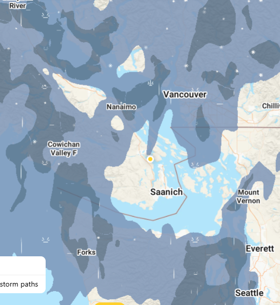 The weather has become rather harsher in the couple of weeks before our flight time. Out here by the Pacific it is seldom as bad, or certainly not as snowy as in the rest of Canada. But just as I write this bit, the day before Christmas, we look at the weather map to see how we might fare if we were to venture out birding. Hmm, Environment Canada is giving us 43 minutes before the arrival of rain and snow. The map sure does look ominous - we live near Saanich. Could we escape out that gap to the east? Naw, not in 43 minutes. OK, it's another log in the woodstove, and let's put on "The last Unicorn"!