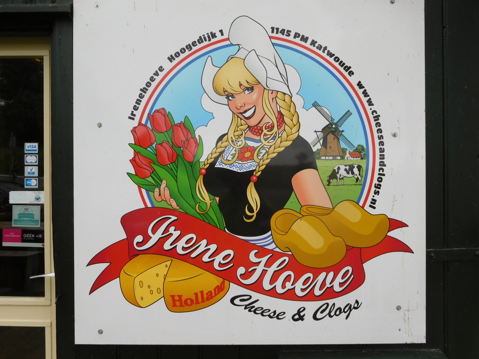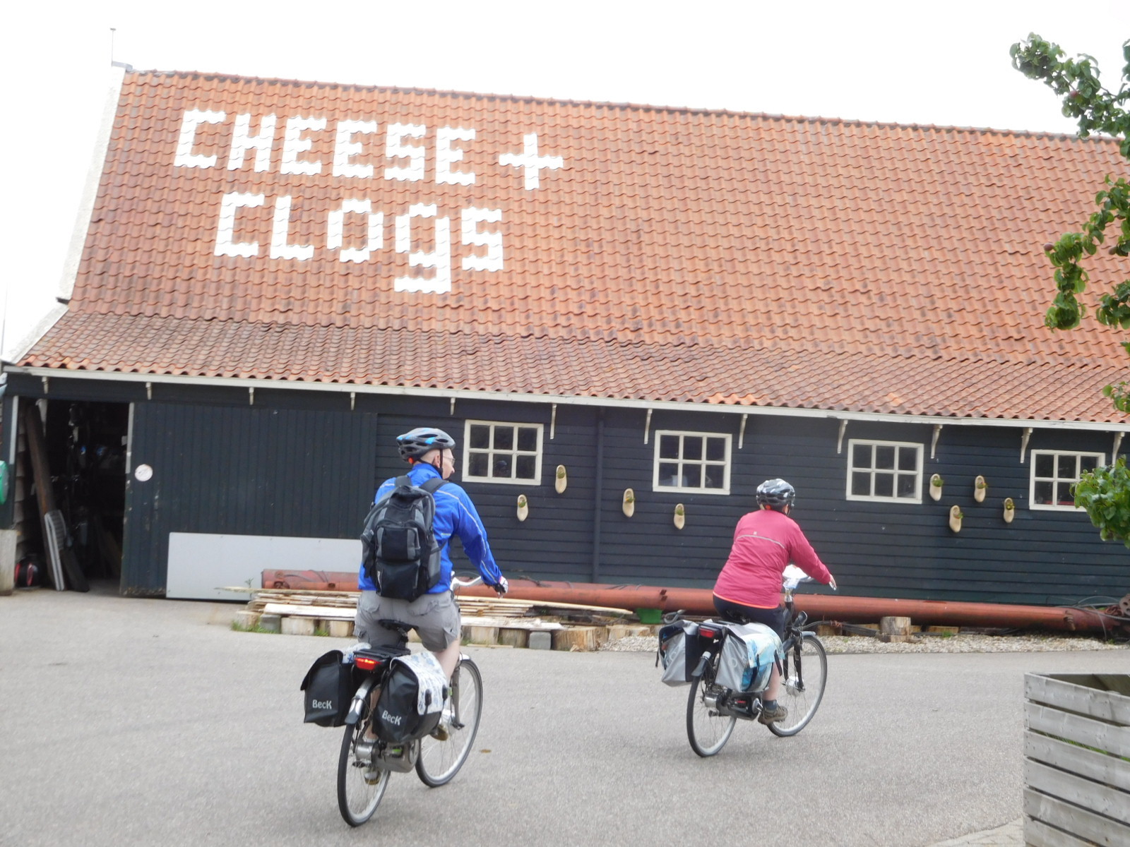 Just beyond Monnickendam, near Katwoude, we came to two very entertaining if touristy attractions. The first seemed so blatant that I was a little surprised Dodie pulled in. Actually, we like touristy things. This one featured the words "Cheese + Clogs" boldly on the roof, and a rather "cheesy" logo.