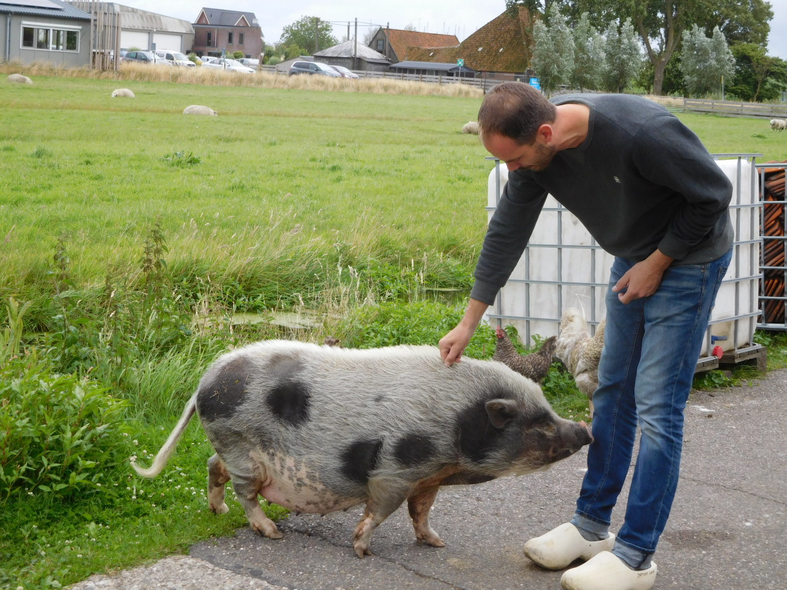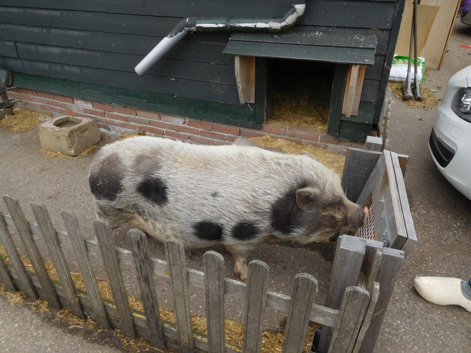 It actually turned out that they were seriously making clogs from scratch here, and that their cheese offerings were very creditable,hiThe man who makes the clogs was very outgoing, and was proud to talk, for example, about his pet pig, Charlotte. Charlotte has been the subject of many newspaper articles, which are posted on the wall. She would for example, spin in a circle or put her foot on the man's foot on request, and go to bed when instructed. However she requires treats of pears to do any of this. The pears are not ripe yet, but the man got some from the tree and Charlotte gave a demonstration.