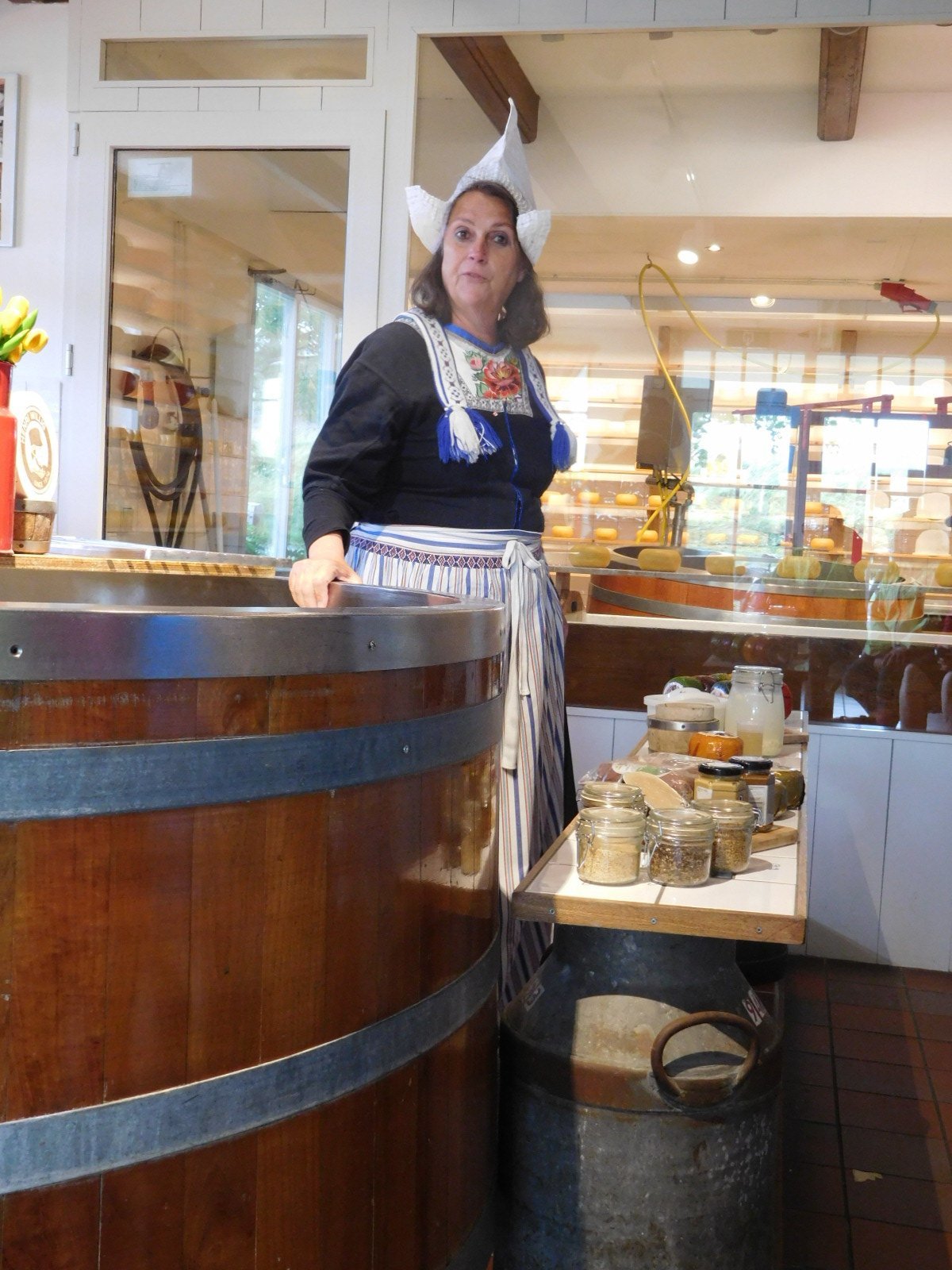 The Willig cheese farm had ladies in traditional dress, explaining how cheese was made. After the brief presentation, I jumped up with some questions. What bacterial culture is used here? How does this differ from other cheeses, to produce the unique regional flavour, what is the rennet made from, what is the difference between Gouda and Edam cheese, does the cheese use pasteurized or unpasteurized milk? The presentation lady really did not have these answers, and I was hindered in interrogating her by Dodie poking me in the ribs. Dodie later told me that in this she was not trying to rescue the lady, but rather to get on with the tour. Fortunately, I later found the man who really knew, and he answered all my questions. In the interests of getting on with this blog, though, I won't try to create a tutorial here. However I will throw in one tidbit. There was a couple who joined us for the presentation who were from New Delhi. The real cheese man, in talking to me about rennet, pointed out that his use of engineered rather than natural rennet had opened the Indian (vegetarian) market to him. The rennet and of course the cheese is still an animal product, but no cows die in its production.