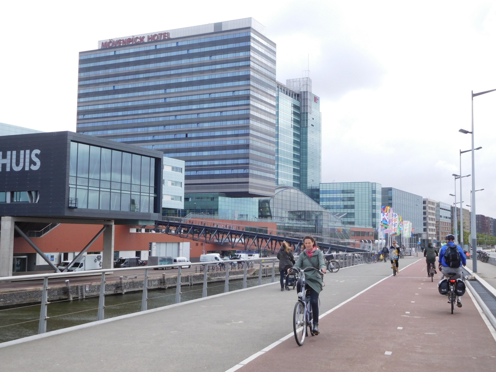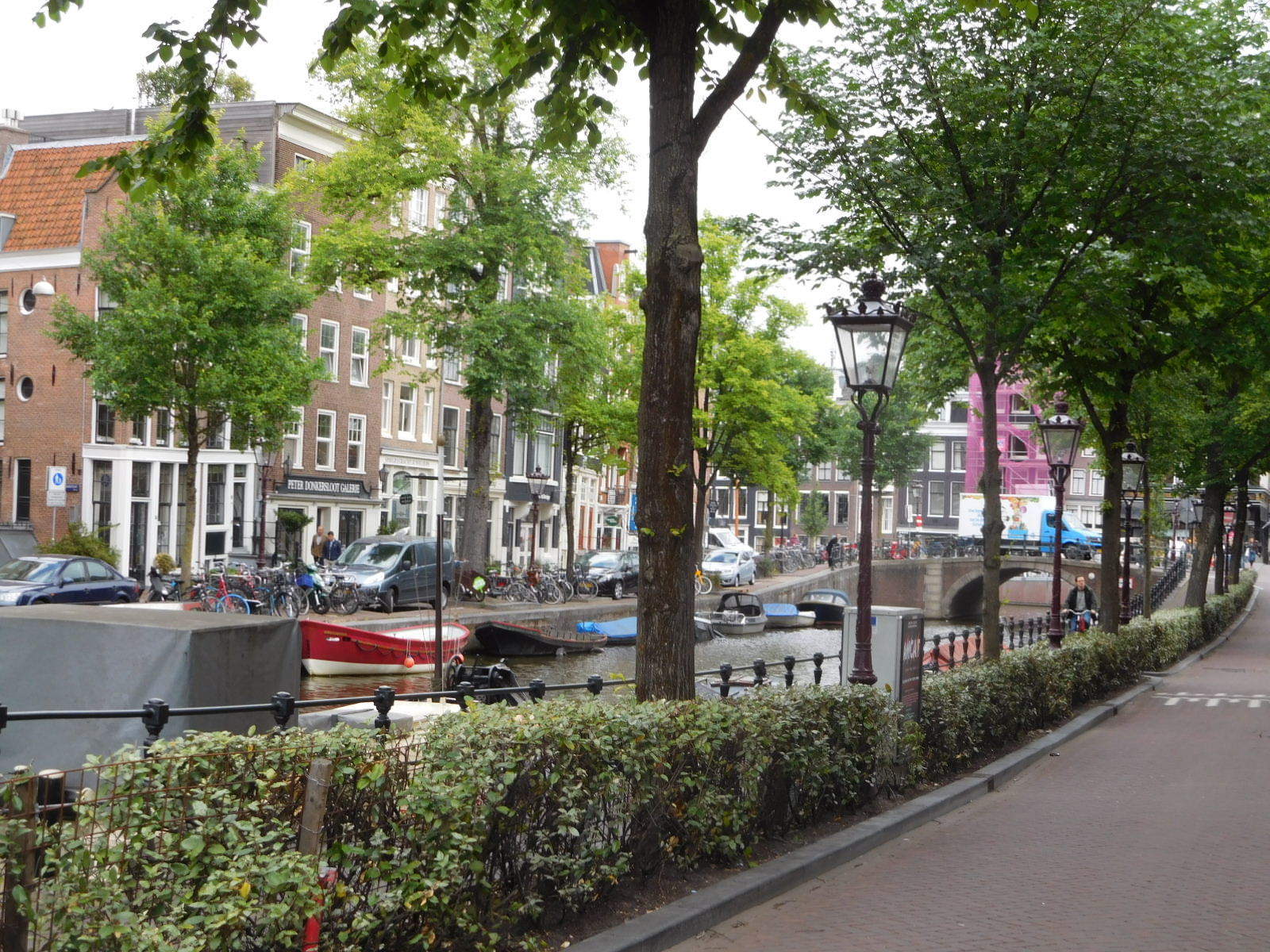 On today's ride in from the airport area, through Vondel Park, and through town to the Central Station, we tried to take the calmest and most direct route. At the same time I was trying to reevaluate and fend off the rather negative reaction I had had to yesterday's foray into Amsterdam. So I will begin with a photo that encapsulates many of the city's great aspects: greenery, canals, boats, bikes, buildings, and bridges.