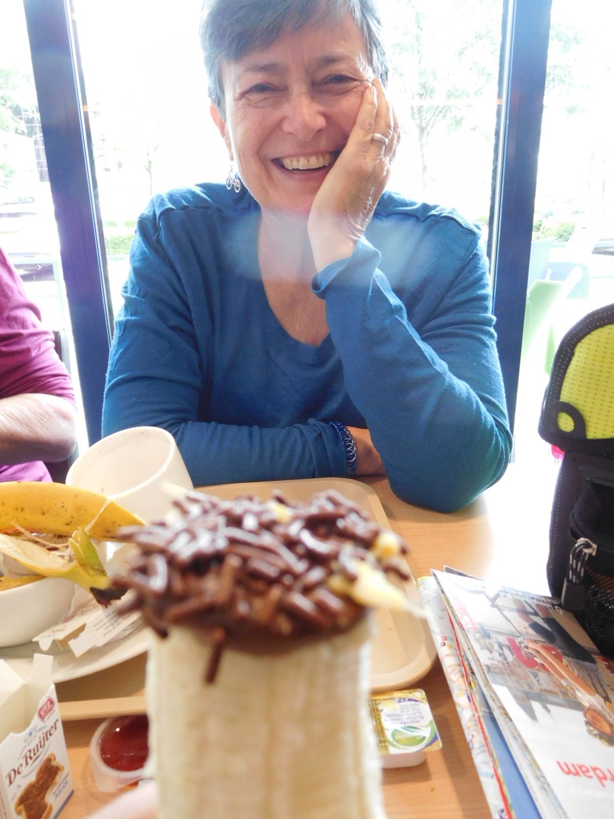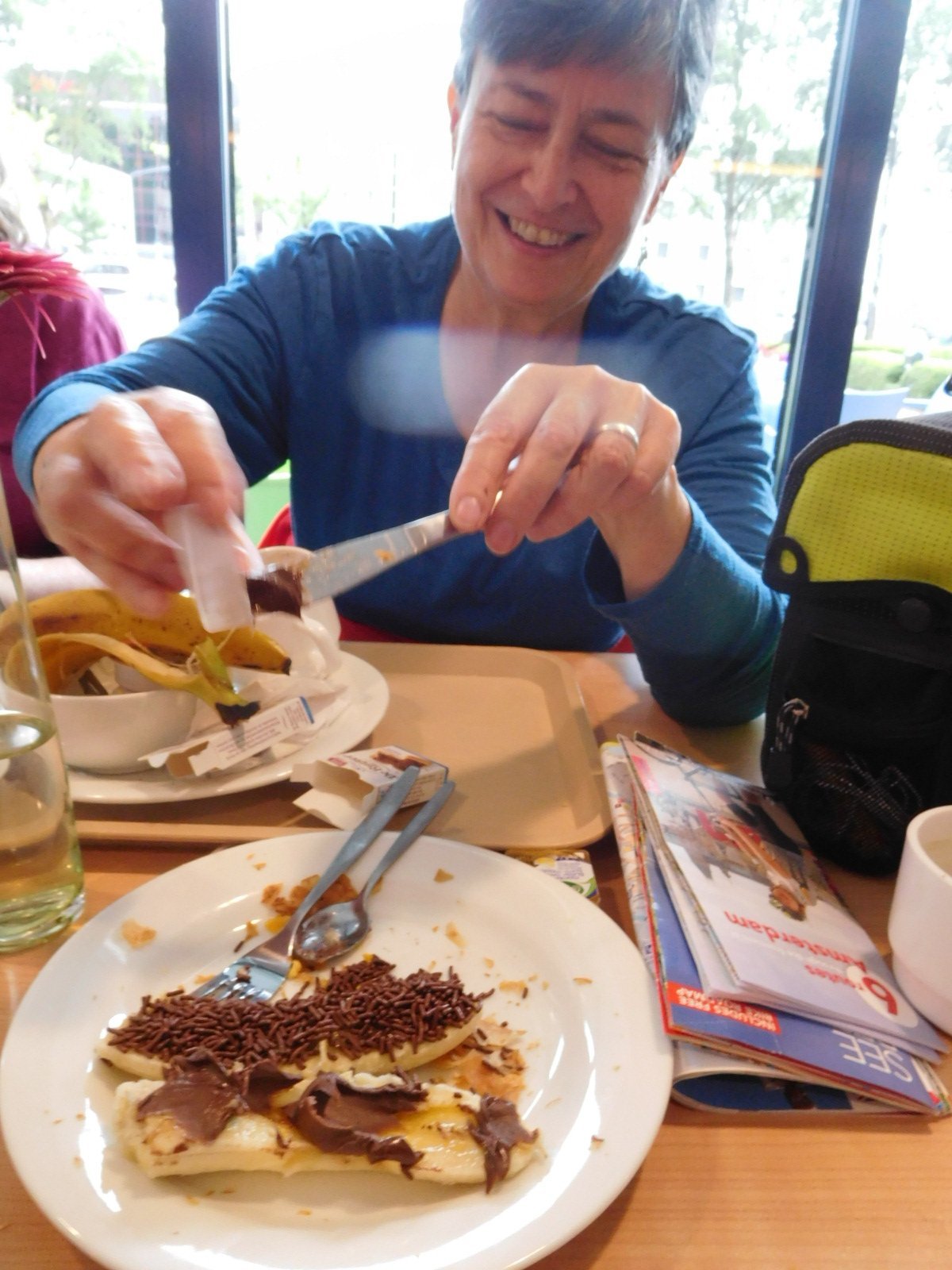 At the breakfast, seeing me eating Nutella straight from the little packet, Erika asked if I knew how great Nutella was if combined with a banana. That led us to slice a banana in half and spread it with Nutella. Erika then had the idea of topping that with chocolate sprinkles. So we turned this nutritious European breakfast into a birthday party. Great for a first/almost last day on the road. Probably chocolate bananas would not power a whole long trip. But maybe they could!