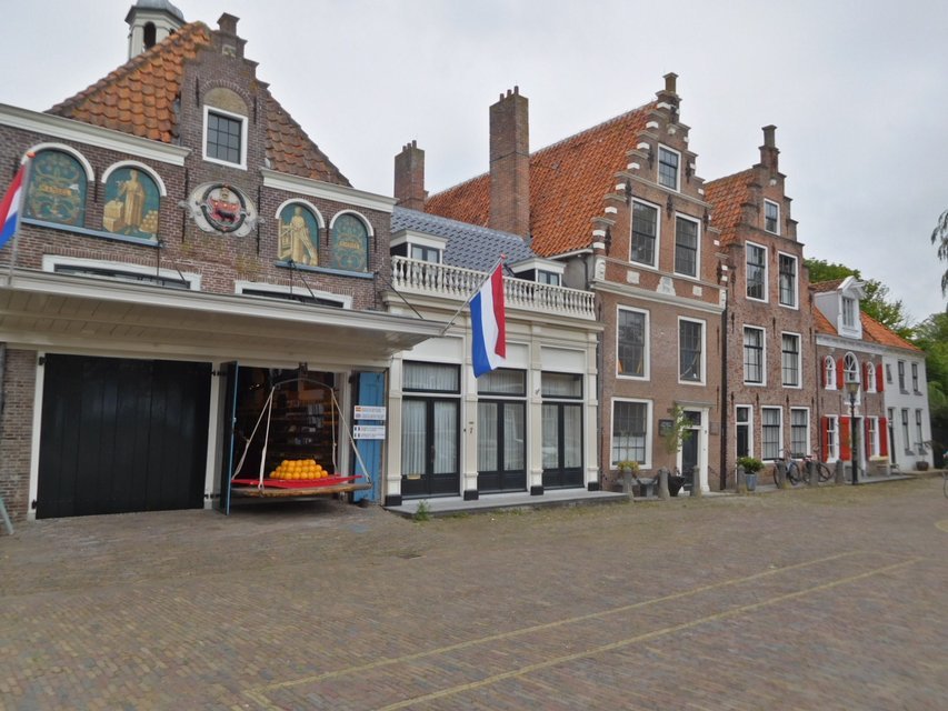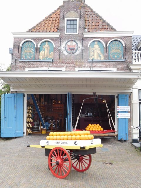 There is a store in the square that holds down the responsibility of giving tourists something to look at when the "market" is not in operation. There is a small display there of antique cheese making equipment, and a good selection of cheese to buy. I asked there one of the same questions I had asked in Gouda - what is the difference between Gouda and Edam cheese? The answer given was the same in both places: Gouda is 48% butter fat while Edam is 40%. (40% is still pretty high - we often buy 18% mozzarella, for pizza.)