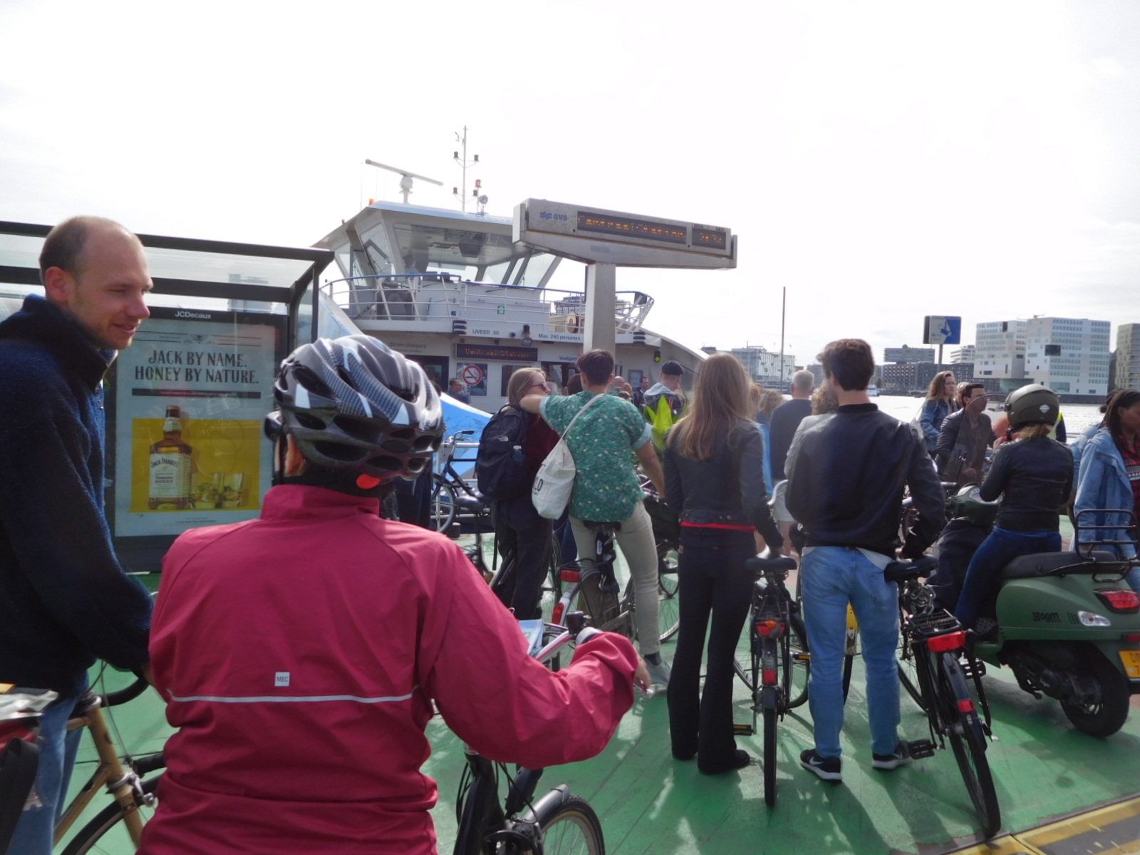The crowds of Amsterdam were of course still on the menu for us, as we needed to return the bikes near the station and make our way 20 or 30 km out to our airport hotel. The first step was the ferry that crosses the bit of water just at the station. It's a study in efficiency, really, scooping up a throng of people and dumping them on one side, then another throng, to the other side.