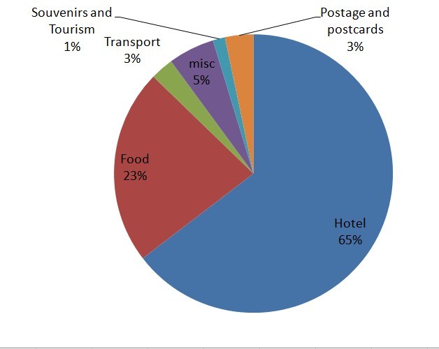 Looking at the cost breakdown, the shocking fact is that 65% was in accommodation. This is a bit exaggerated, because many places included breakfast, so part of the accommodation was actually food. And to the extent that we could carry some of that breakfast along with us, the accommodation cost was further reducing the food category.